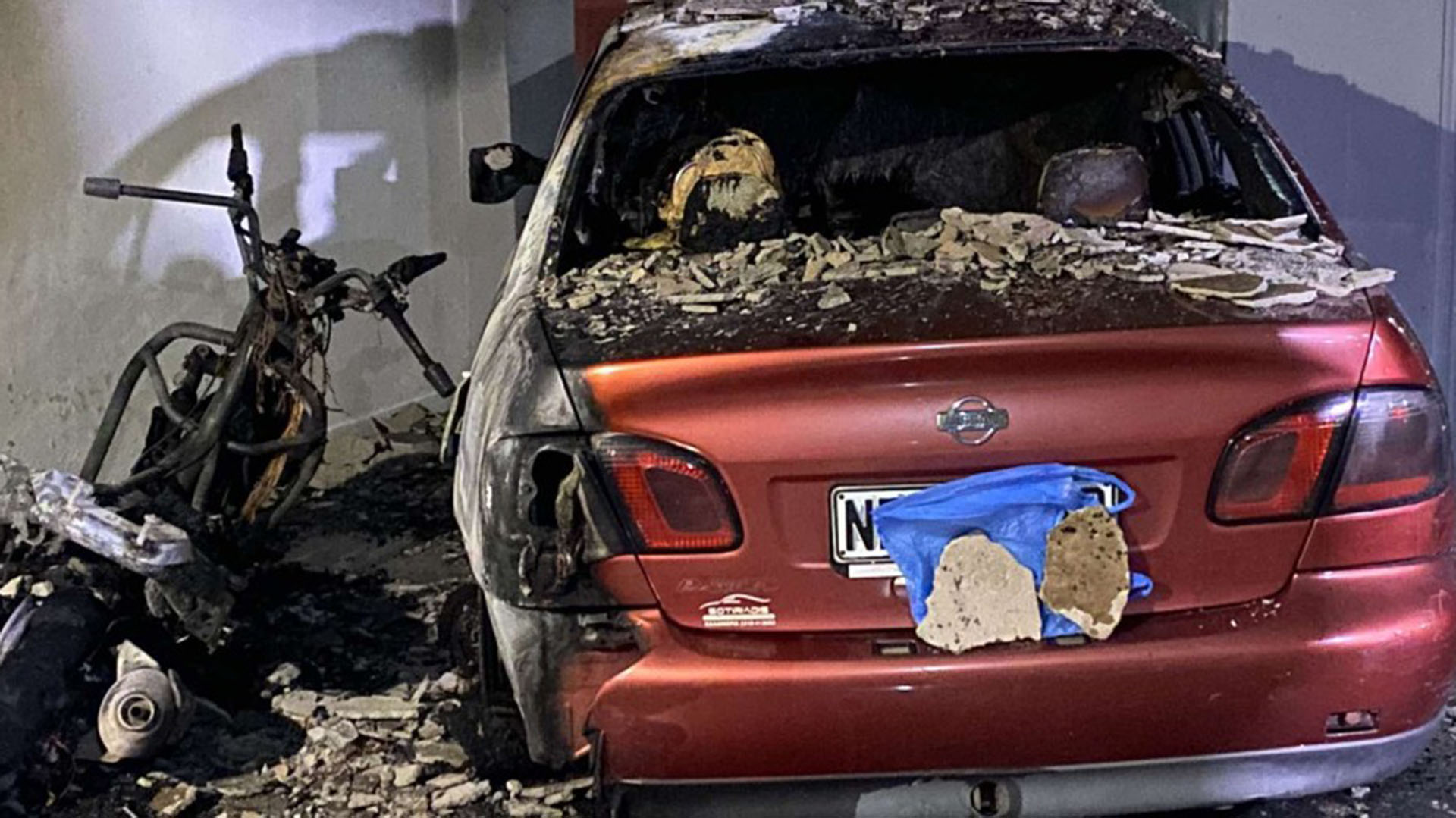 Η πυρκαγιά ξέσπασε αργά χθες το βράδυ από άγνωστη αιτία, ενώ από το θερμικό φορτίο που αναπτύχθηκε έλιωσαν τα πλαστικά παρακείμενου αυτοκινήτου και προκλήθηκαν ζημιές στο ταβάνι της πιλοτής.