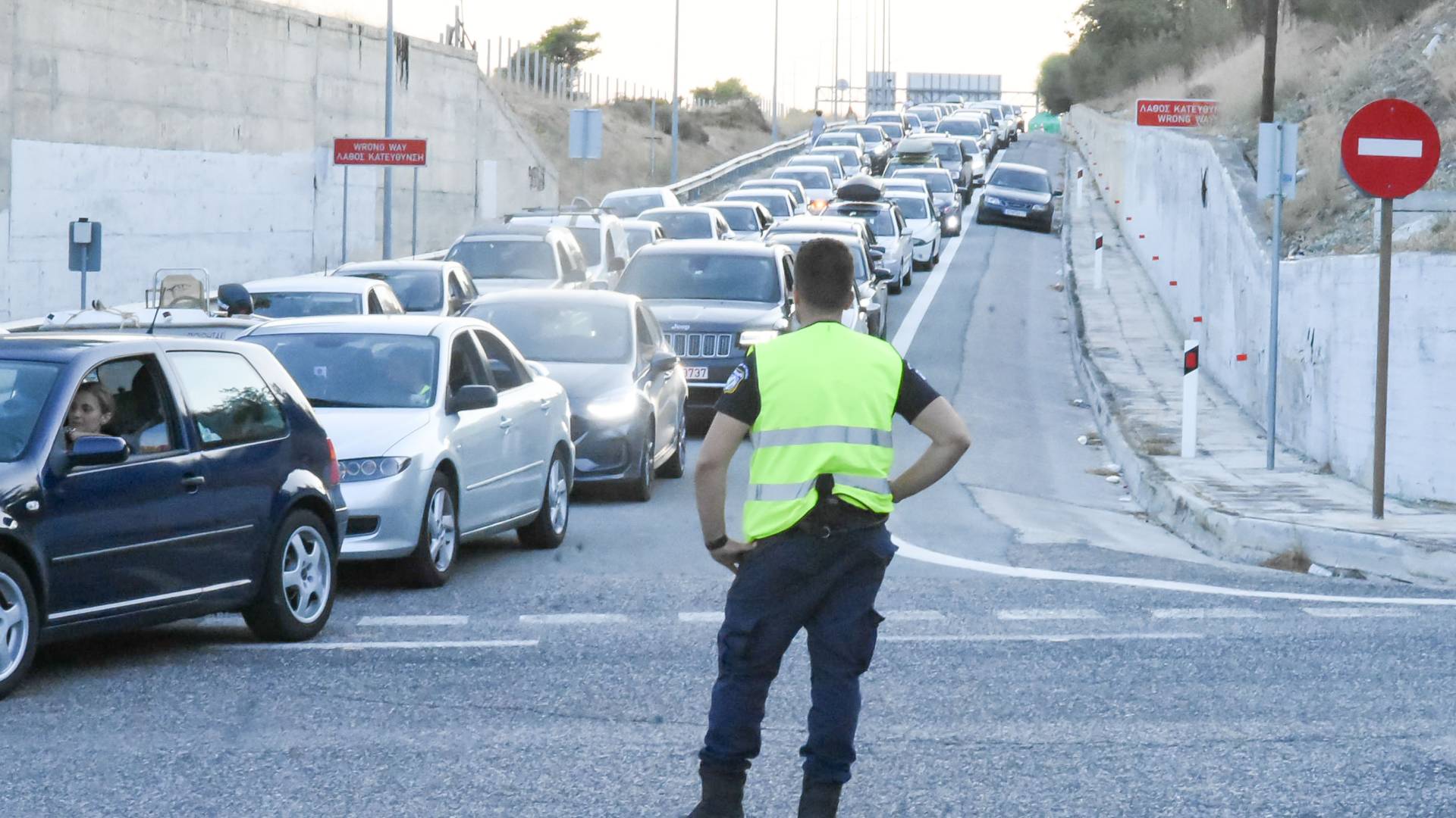 Ανδρες της Τροχαίας εκτρέπουν τα οχήματα σε εναλλακτικές διαδρομές.
