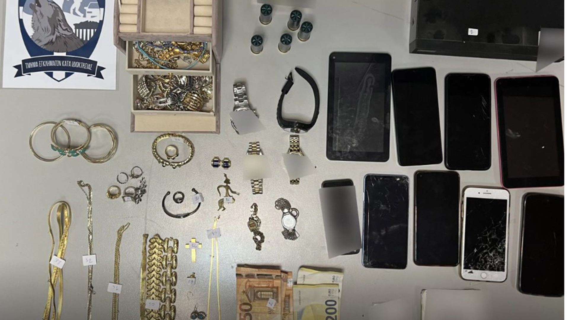 Κατασχέθηκαν, μεταξύ άλλων, από τις αστυνομικές αρχές 17 επώνυμα ρολόγια χειρός, πλήθος κοσμημάτων, χρυσαφικών, μενταγιόν και αξεσουάρ, πλήθος διαρρηκτικών εργαλείων, μαχαίρι τύπου σουγιά, πλαστικό πιστόλι τύπου ρέπλικα και φυσίγγια.