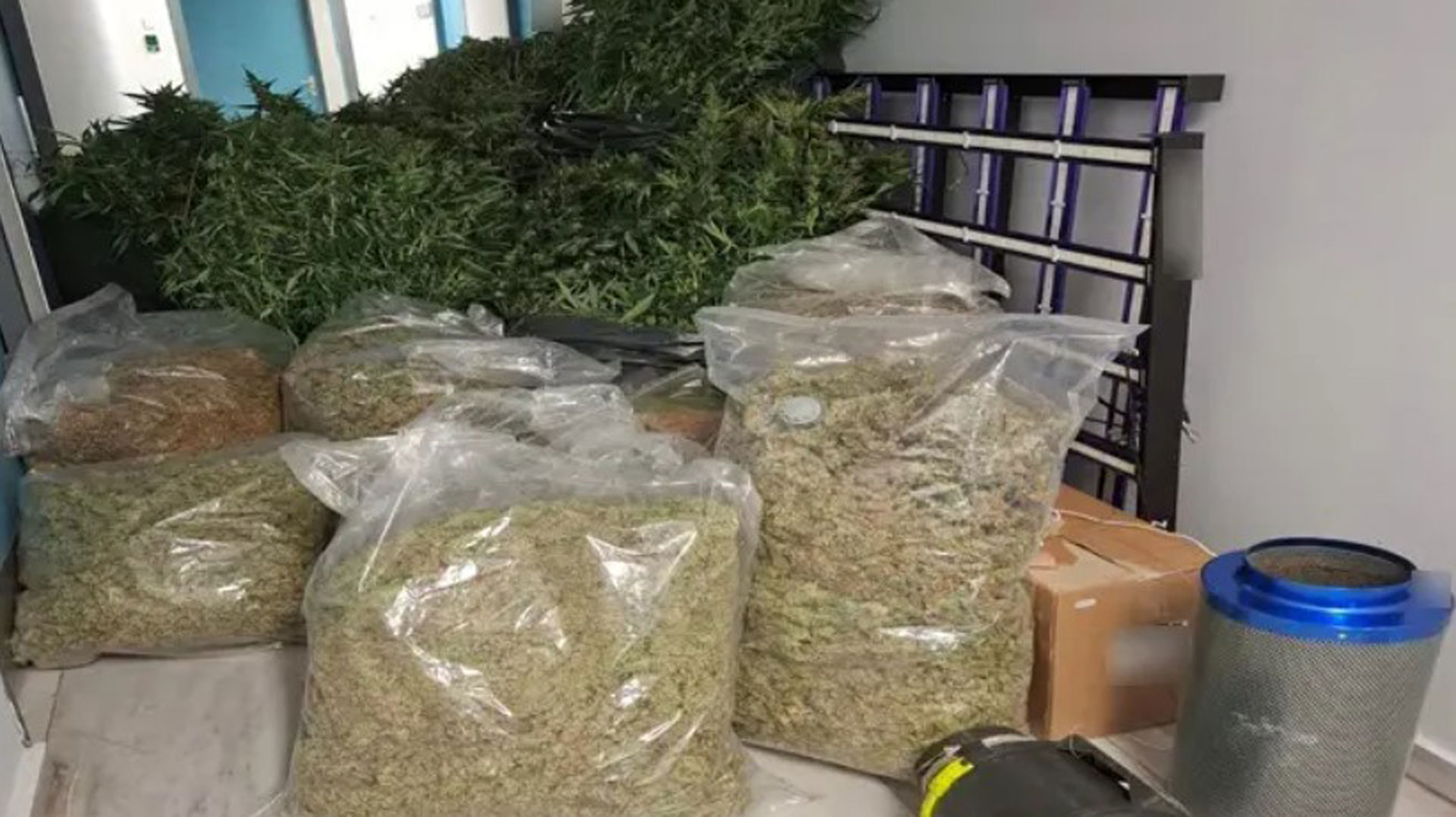 Συνολικά, από την κατοχή των συλληφθέντων και από τις κατ’ οίκον έρευνες κατασχέθηκαν 109,5 κιλά, εκ των οποίων 42,5 κιλά ακατέργαστης κάνναβης, 42,9 κιλά κλώνων και φύλλων κάνναβης και 24,1 κιλά φύλλων κάνναβης.