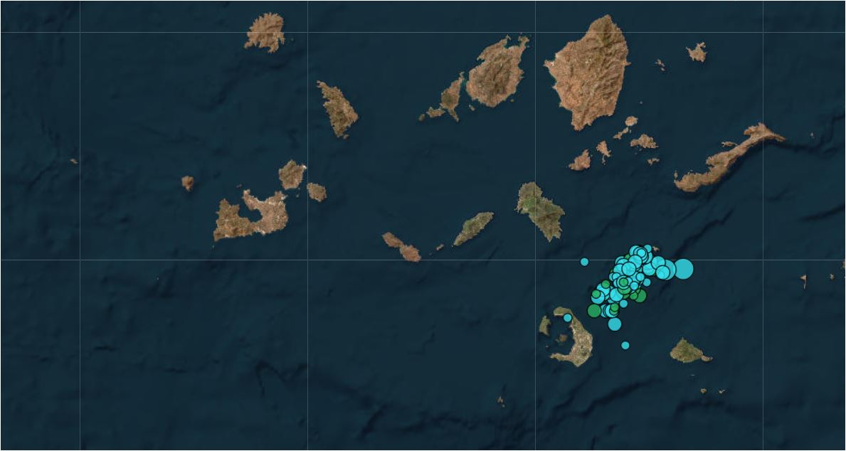 Ο πιο πρόσφατος σεισμός έγινε στις 15:29 και είχε μέγεθος 4,4 βαθμούς της κλίμακας Ρίχτερ. Η δόνηση σημειώθηκε 35,2 ανατολικά- βορειοανατολικά της Θήρας, με το εστιακό βάθος να εντοπίζεται στα 2 χλμ.