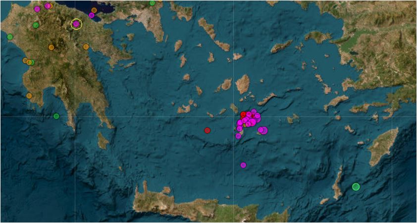 Υπενθυμίζεται πως ο πιο πρόσφατος σεισμός, μεγέθους 4,4 βαθμών της κλίμακας Ρίχτερ και εστιακού βάθους 2 χλμ., σημειώθηκε στις 15:29 35,2 ανατολικά της Σαντορίνης.