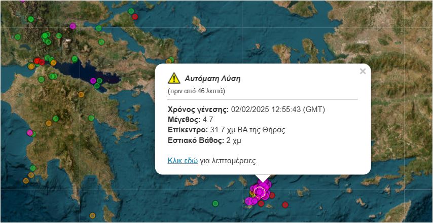 Νέος σεισμός μεγέθους 4,7 βαθμών της κλίμακας Ρίχτερ, ο μεγαλύτερος των τελευταίων ωρών, σημειώθηκε στις 14:55 στη θαλάσσια περιοχή μεταξύ Σαντορίνης και Αμοργού.