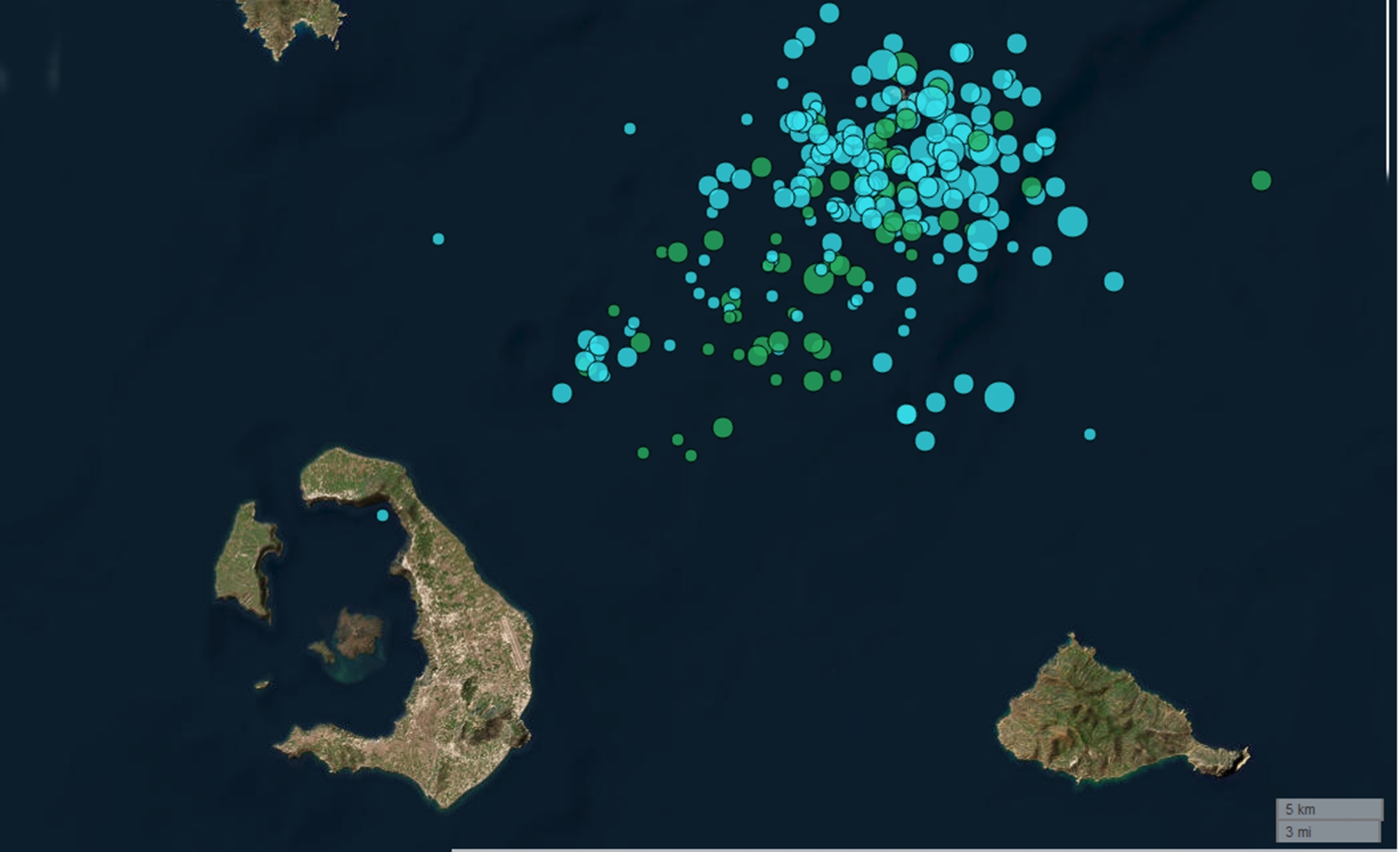 2. Το τελευταίο 24ωρο καταγράφεται στην περιοχή της Ανύδρου, μεταξύ Θήρας και Αμοργού, αυξημένη σεισμική ακολουθία με μέγιστο μέγεθος το 4.3. Αυτή η σεισμική δραστηριότητα δεν σχετίζεται με ηφαιστειακή δραστηριότητα, καθώς οφείλεται σε υποθαλάσσια ρήγματα με διεύθυνση ΒΑ-ΝΔ.