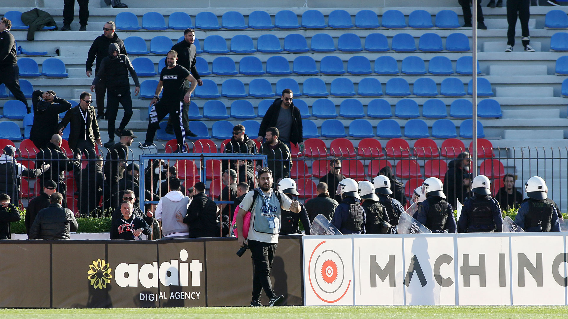 Από τις έρευνες στις κερκίδες, εντοπίστηκαν και κατασχέθηκαν σπασμένα πλαστικά καθίσματα, σιδερένια βέργα, κομμάτια πλαστικού, πλαστικό μπουκάλι και μία μεταλλική αγκράφα ζώνης.