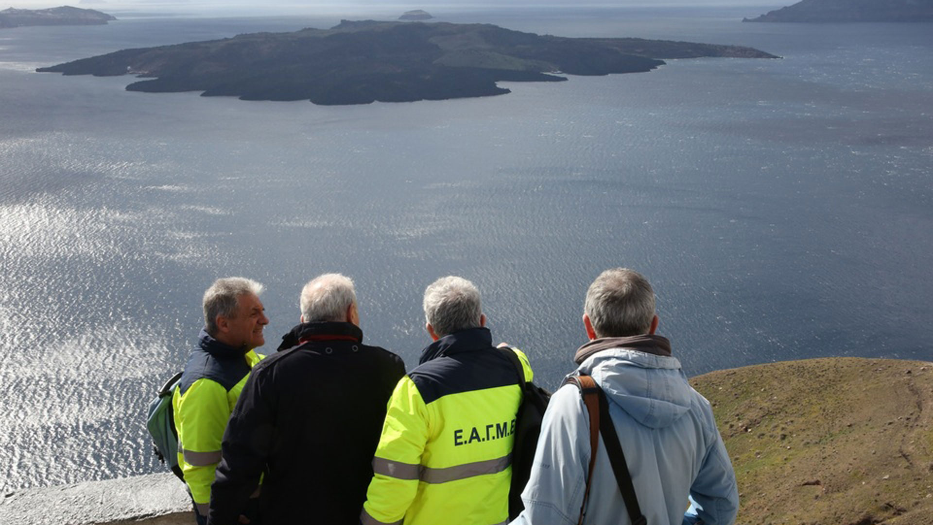 Αυτοψία στην Καλντέρα της Σαντορίνης, στο ύψος του τελεφερίκ, πάνω από το Παλιό Λιμάνι, πραγματοποίησε ο πρόεδρος του ΟΑΣΠ και καθηγητής Διαχείρισης Φυσικών Καταστροφών, Ευθύμης Λέκκας, μαζί με κλιμάκιο της Ελληνικής Αρχής Γεωλογικών Μεταλλευτικών Ερευνών.