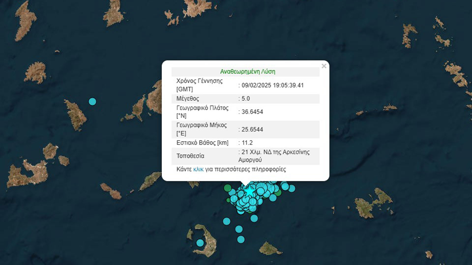 Ισχυρή σεισμική δόνηση, μεγέθους 5 Ρίχτερ, σημειώθηκε το βράδυ της Κυριακής, στις 21:05, στη θαλάσσια περιοχή ανάμεσα σε Σαντορίνη και Αμοργό.