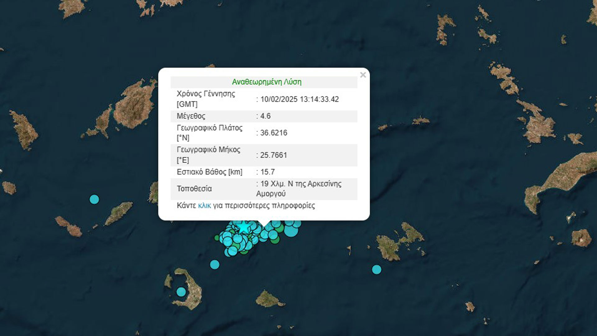 Περίπου 17 λεπτά αργότερα, καταγράφηκε νέα δόνηση μεγέθους 4,3 Ρίχτερ, 17 χιλιόμετρα νότια νοτιοανατολικά της Αρκεσίνης Αμοργού.