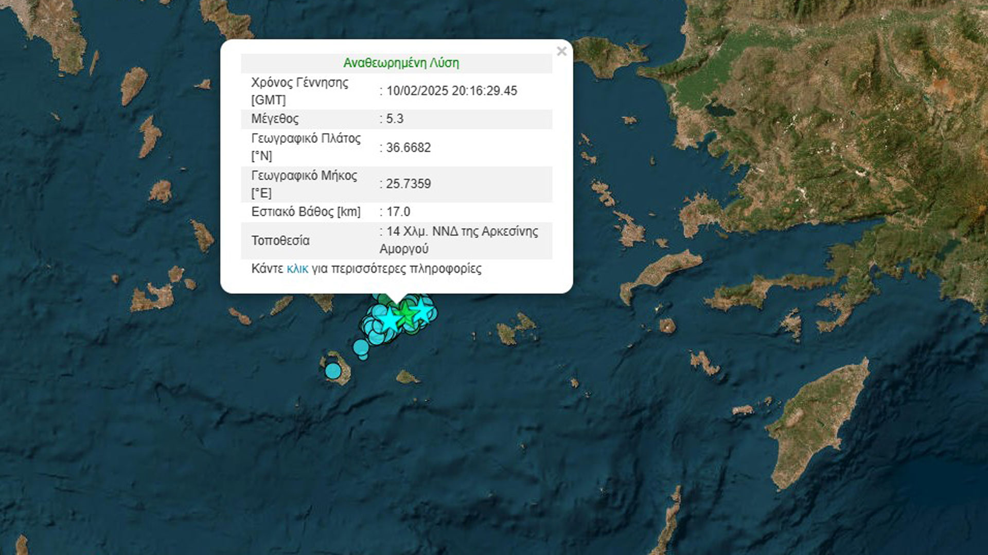 Ισχυρή δόνηση 5,3 βαθμών της κλίμακας Ρίχτερ σημειώθηκε στις 22.16, που έγινε ιδιαίτερα αισθητή και στην Αττική. Πρόκειται για την ισχυρότερη δόνηση που έχει σημειωθεί μέχρι σήμερα από την έναρξη της σεισμικής ακολουθίας στην περιοχή των Κυκλάδων.