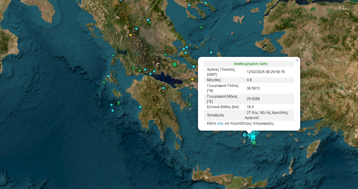 Συγκεκριμένα, σύμφωνα με το Γεωδυναμικό Ινστιτούτο του Εθνικού Αστεροσκοπείου Αθηνών, στις 11:20 σημειώθηκε δόνηση 4,6 βαθμών της κλίμακας Ρίχτερ, σε απόσταση 233 χλμ. νοτιοανατολικά της Αθήνας. Σύμφωνα με το Γεωδυναμικό Ινστιτούτο του Εθνικού Αστεροσκοπείου Αθηνών, το επίκεντρο της δόνησης εντοπίζεται στον θαλάσσιο χώρο 25 χλμ. νότια-νοτιοδυτικά της Αρκεσίνης Αμοργού