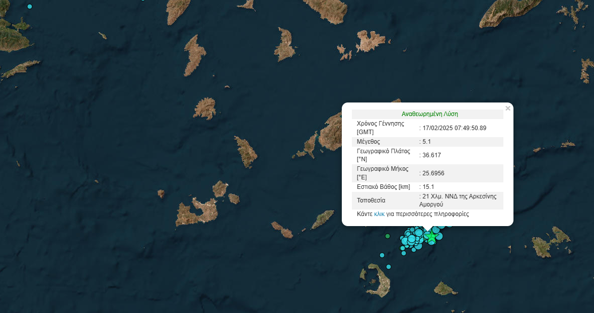 Κατά το χρονικό διάστημα μεταξύ της 26ης Ιανουαρίου και της Παρασκευής 14ης Φεβρουαρίου καταγράφηκαν πάνω από 16.900 σεισμοί μεγέθους άνω του ενός βαθμού στη ζώνη μεταξύ Αμοργού και Σαντορίνης, σύμφωνα με το Εργαστήριο Σεισμολογίας του Εθνικού και Καποδιστριακού Πανεπιστημίου της Αθήνας (ΕΚΠΑ).
