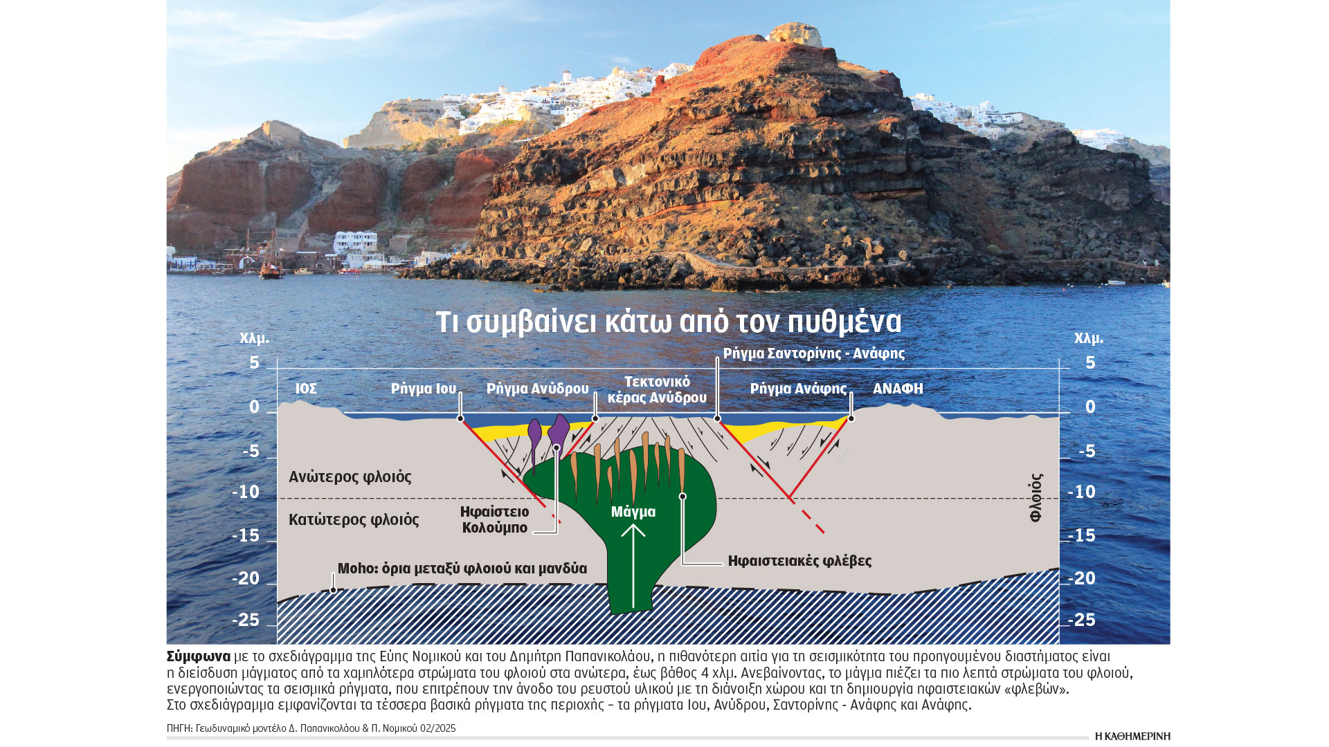 Εντυπη έκδοση. Δεν βρισκόμαστε μπροστά στη δημιουργία νέου ηφαιστειακού κρατήρα, τόσο η Καμένη όσο και το Κολούμπο δεν εμπλέκονται στην παρούσα σεισμική δραστηριότητα, ξεκαθαρίζουν στην «Κ» οι σεισμολόγοι Δημήτρης Παπανικολάου και Κώστας Παπαζάχος. Οι σεισμοί στη Σαντορίνη είναι πρωτόγνωρο φαινόμενο, εξηγούν, τονίζοντας ότι εξετάζουν και αναλύουν δεδομένα διαρκώς. Και καταλήγουν ότι η σεισμική ακολουθία με υφέσεις και εξάρσεις μπορεί να διαρκέσει μήνες.