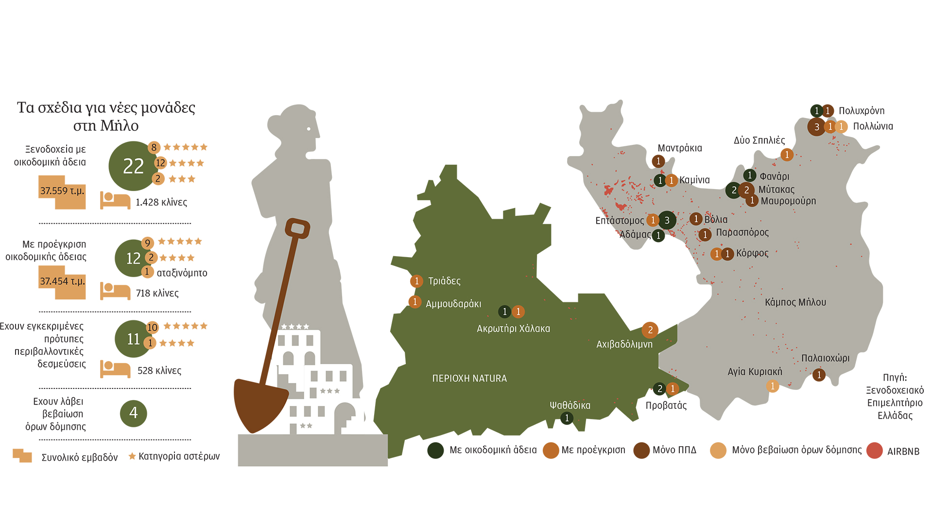 Τα στοιχεία παρουσιάζουν ιδιαίτερο ενδιαφέρον. Δύο από τα ξενοδοχεία θα είναι τεραστίων διαστάσεων – το ένα εγκρίθηκε με σειρά κρατικών αποφάσεων μέσα στην καρδιά του βιοτόπου της απειλούμενης οχιάς της Μήλου και το δεύτερο, που βρίσκεται εκτός προστατευόμενης περιοχής, θα έχει 125 πισίνες, μία για κάθε δωμάτιο. Ενδιαφέρον παρουσιάζουν και οι αδειοδοτήσεις: πολλά από τα ξενοδοχεία δηλώνουν 99 κλίνες, καθώς οι 100 κλίνες είναι το όριο για την υποχρέωση εκπόνησης μελέτης περιβαλλοντικών επιπτώσεων. Το δε καταφύγιο άγριας ζωής του νησιού δεν αποτυπώνεται στις άδειες, όπως εκείνη του Σαρακήνικου, καθώς αυτό δεν προβλέπεται στα χαμηλότερα επίπεδα περιβαλλοντικής αδειοδότησης. Αν λαμβανόταν υπόψη, αυτό θα συνεπαγόταν επιπρόσθετες υποχρεώσεις.