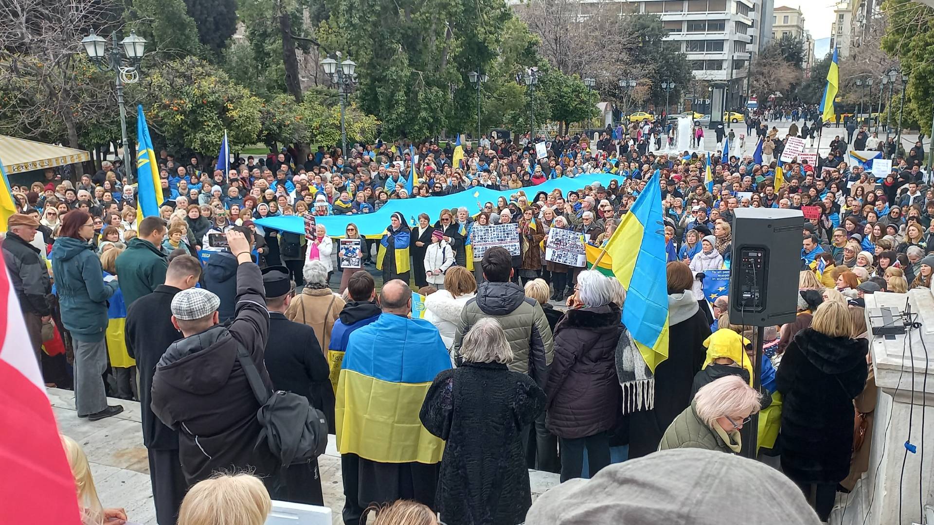 Με πορεία από τα Προπύλαια προς το Σύνταγμα και δυναμικάσυνθήματα, πλήθος κόσμου έδωσε το παρών την Κυριακή, για την τρίτη επέτειο από τη ρωσική εισβολή στην Ουκρανία. Στη συγκέντρωση συμμετείχαν μέλη της ουκρανικής διασποράς, εκπρόσωποι ξένων πρεσβειών και Eλληνες που στηρίζουν την Ουκρανία.