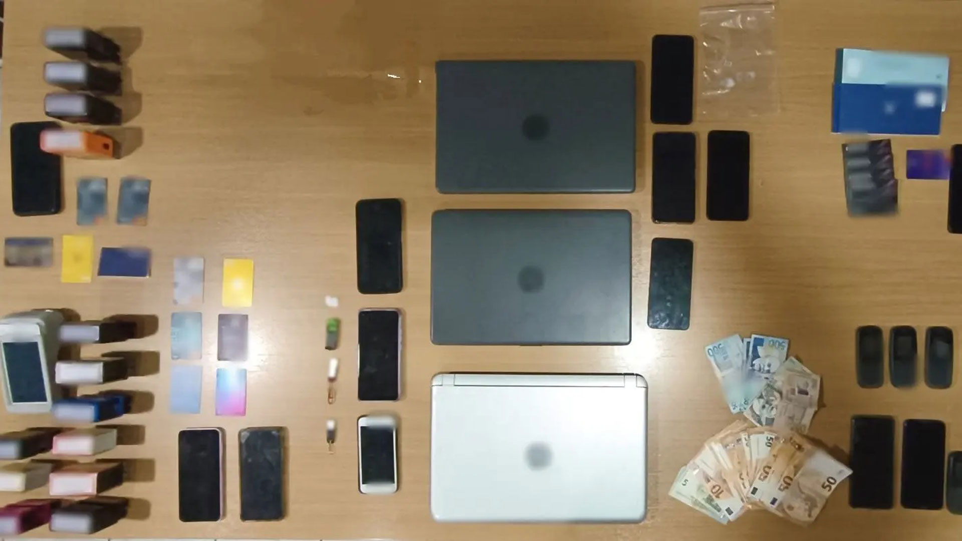 Μεταξύ άλλων, κατασχέθηκαν χρήματα (σε ευρώ και λεκ Αλβανίας), οχήματα, πληθώρα ηλεκτρονικών συσκευών και τραπεζικών καρτών, σφραγίδες εμπλεκόμενων εταιρειών κ.ά.