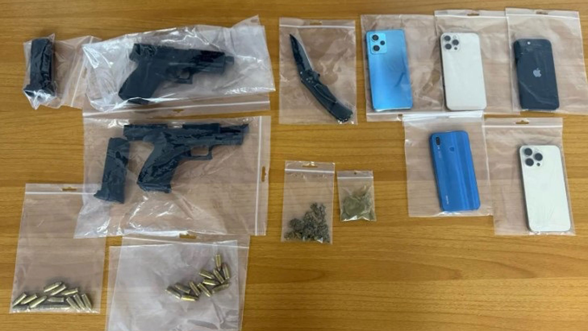 - πιστόλι με φυσίγγιο στη θαλάμη και πιστόλι χωρίς σειριακό αριθμό, με 2 γεμιστήρες με 11 φυσίγγια η καθεμία,