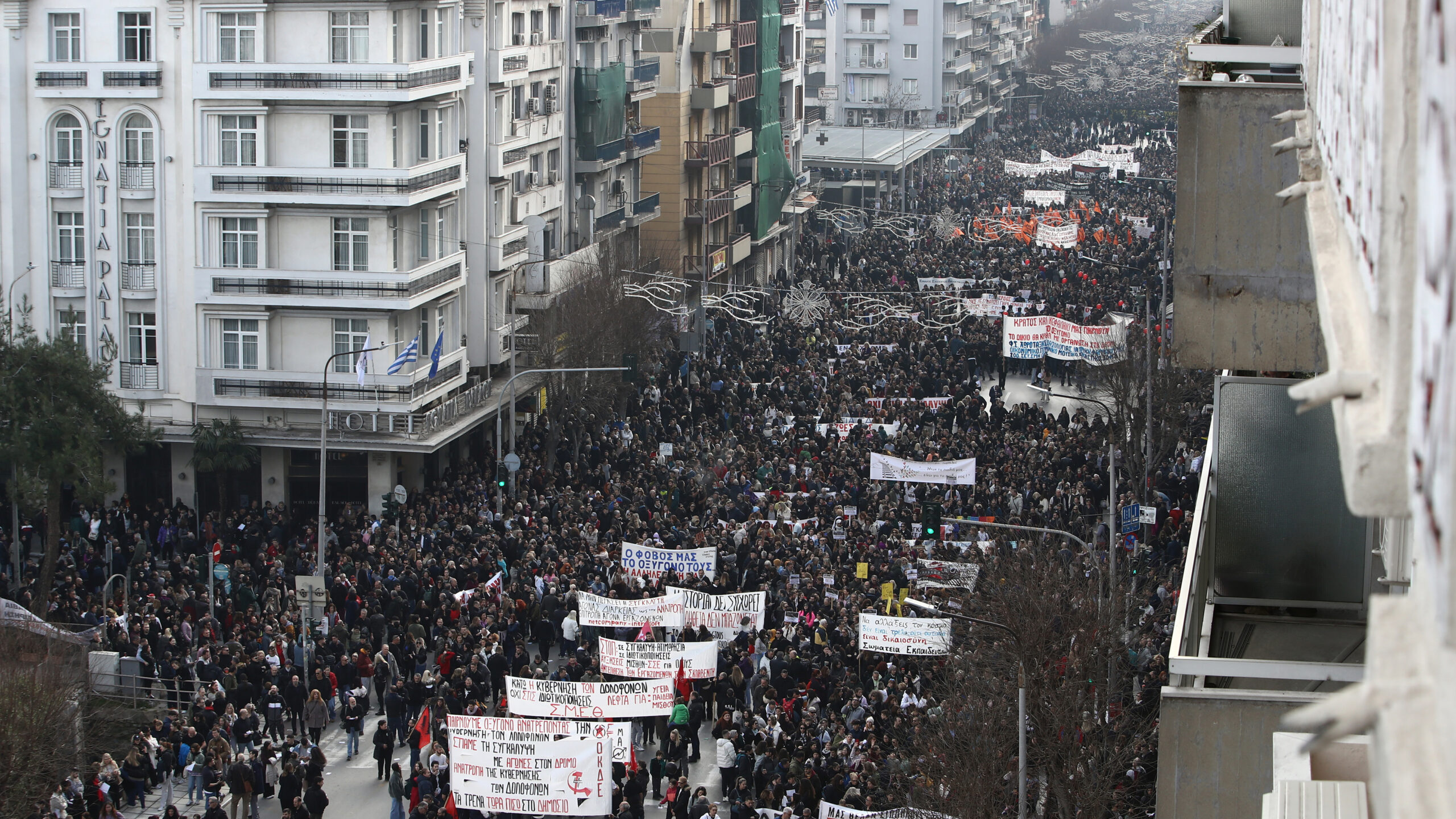 Χιλιάδες πολίτες, από πολύ νωρίς, πλημμύρισαν το κέντρο της Θεσσαλονίκης συμμετέχοντας στη συγκέντρωση με αφορμή τα δύο χρόνια από το σιδηροδρομικό δυστύχημα των Τεμπών.
