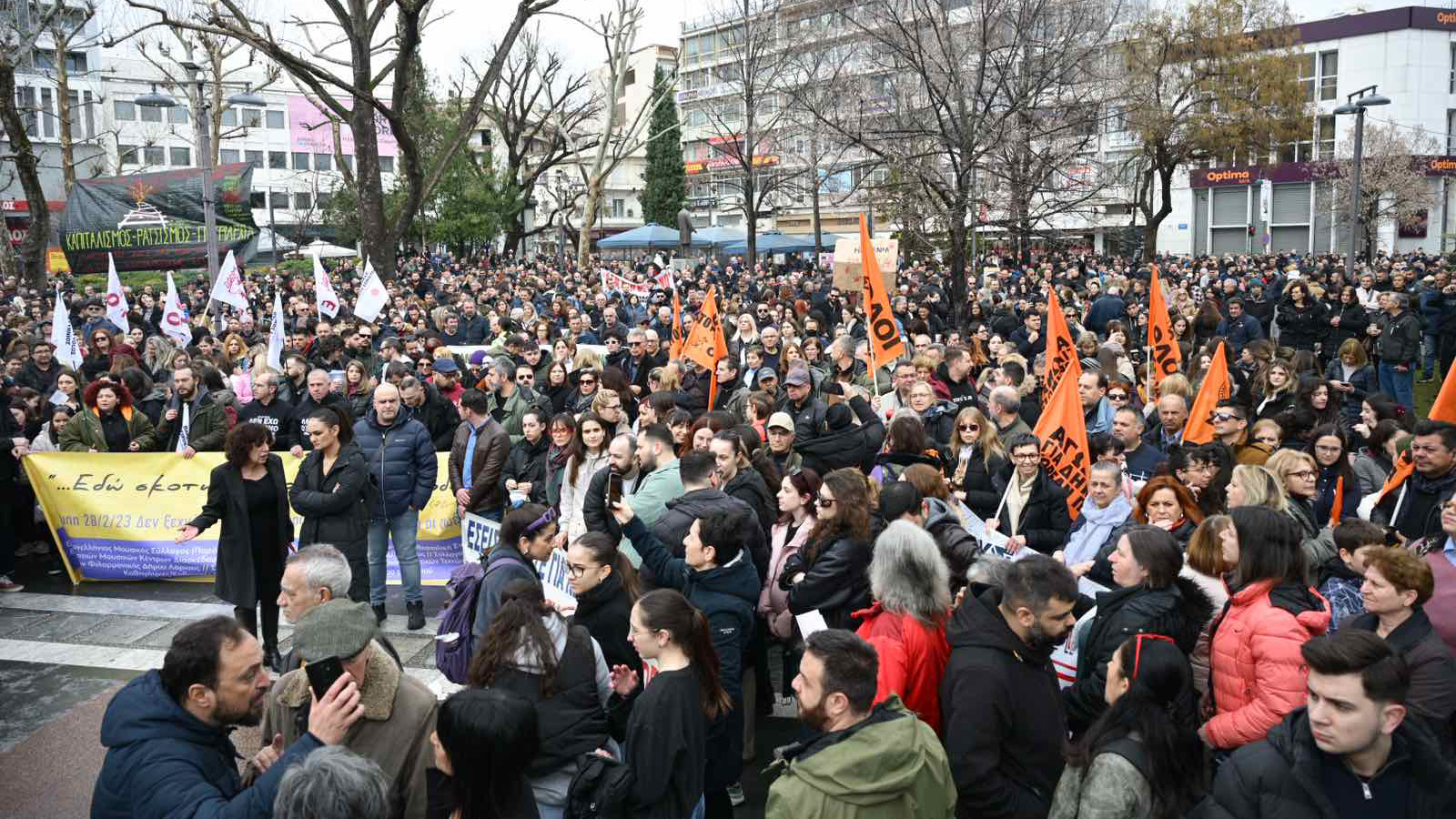 Σε εξέλιξη βρίσκεται η συγκέντρωση διαμαρτυρίας στην κεντρική πλατεία της Λάρισας για το δυστύχημα στα Τέμπη.