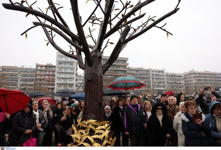 Σε κλίμα συγκίνησης πραγματοποιήθηκαν το μεσημέρι σε χώρο πρασίνου στη Νέα Παραλία της Θεσσαλονίκης τα αποκαλυπτήρια του γλυπτού με τίτλο «Το δέντρο της μνήμης», που είναι αφιερωμένο στα 57 θύματα των Τεμπών.