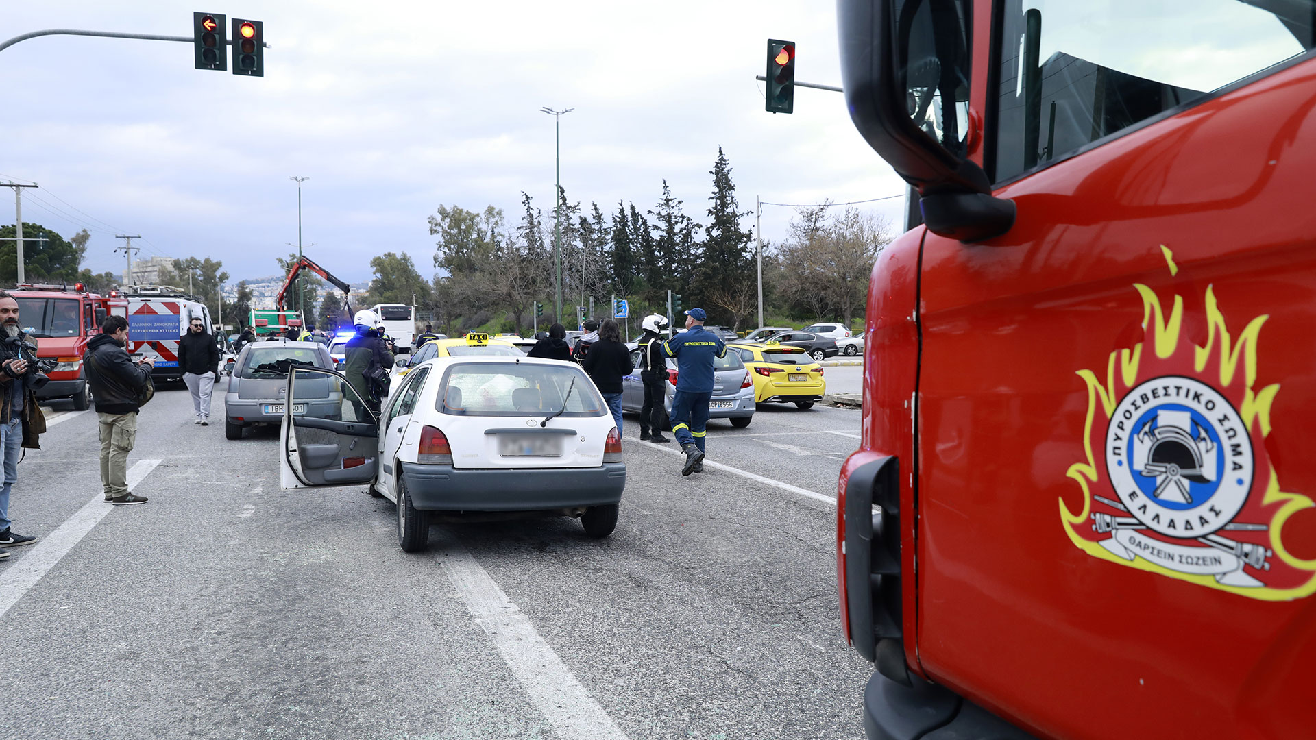 Το λευκό TOYOTA STARLET είχε αναπτύξει ταχύτητα, ενώ τα υπόλοιπα οχήματα ήταν σταματημένα στον ερυθρό σηματοδότη.