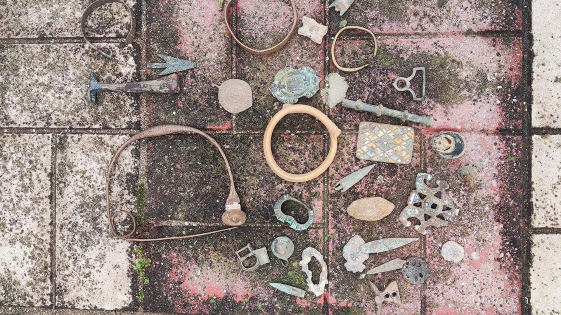 Συνολικά κατά τις αστυνομικές έρευνες κατασχέθηκαν –μεταξύ άλλων– μία πήλινη κεφαλή, μικρό ασημένιο άγαλμα, ένας σταυρός, 18 δαχτυλίδια, τρία βραχιόλια, 17 κοσμήματα, τρία αγαλματίδια, επιτύμβια στήλη οθωμανικής περιόδου και 27 αγγεία, χιλιάδες νομίσματα, θρησκευτικές εικόνες, δύο μονόλιμπρα εκρηκτικής ύλης ΤΝΤ (μικτού συνολικού βάρους 879 γραμμαρίων – για πρόκληση εκρήξεων ενόψει ανασκαφών), δεκάδες συσκευές εντοπισμού και ανίχνευσης μετάλλων, ένα περίστροφο κι ένα πιστόλι κρότου. Τα κατασχεθέντα αρχαία αντικείμενα και οι εικόνες απεστάλησαν στην αρμόδια Εφορεία Αρχαιοτήτων για φύλαξη και τελική εκτίμηση και αξιολόγηση.