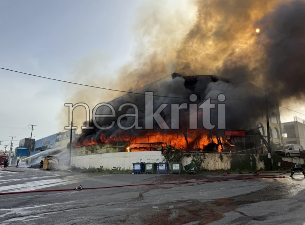 Το εργοστάσιο βρίσκεται στη βιομηχανική περιοχή του Ηρακλείου, με την πυρκαγιά να ξεκινά στον περιβάλλοντα χώρο από άγνωστη μέχρι στιγμής αιτία.