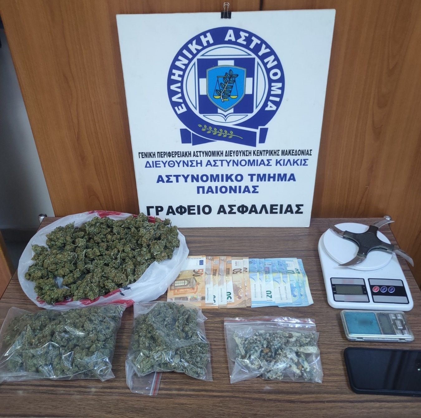 Σύμφωνα με ανακοίνωση της αστυνομίας, σε έρευνα που ακολούθησε στο σπίτι του βρέθηκαν και κατασχέθηκαν 624 γραμμάρια ακατέργαστης κάνναβης, 47 γραμμάρια παραισθησιογόνων μανιταριών, δύο ηλεκτρονικές ζυγαριές ακριβείας, ένα πολεμικό μαχαίρι με τέσσερις λεπίδες και το χρηματικό ποσό των 510 ευρώ.
