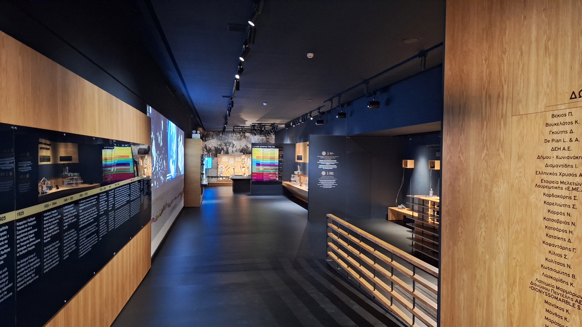Στη συνέχεια ο επισκέπτης συναντάει μια γωνιά αφιερωμένη στους ανθρώπους που εργάστηκαν στα ελληνικά μεταλλεία. Ακολουθεί στην κεντρική αίθουσα μια συλλογή από ορυκτά, πετρώματα, πολύτιμους και ημιπολύτιμους λίθους από όλη τη χώρα. Και με την απαραίτητη δόση χιούμορ, καθώς σε μια οθόνη αφής ο επισκέπτης μπορεί «σπάζοντας» ένα πέτρωμα να ακούσει πώς τα ορυκτά έχουν βρει τη θέση τους στη γλώσσα μας, μέσα από λαϊκές εκφράσεις (για παράδειγμα, «ποιος θα πληρώσει το μάρμαρο;»). Την παράσταση «κλέβει» η σκοτεινή αίθουσα στην οποία παρουσιάζεται η συλλογή φθοριζόντων ορυκτών και πετρωμάτων. Ο φωτισμός της αίθουσας είναι τέτοιος που προκαλεί φθορισμό ή φωσφορισμό στα εκθέματα και ο επισκέπτης γνωρίζει έτσι ένα από τα πιο εντυπωσιακά γεωλο-γικά φαινόμενα.