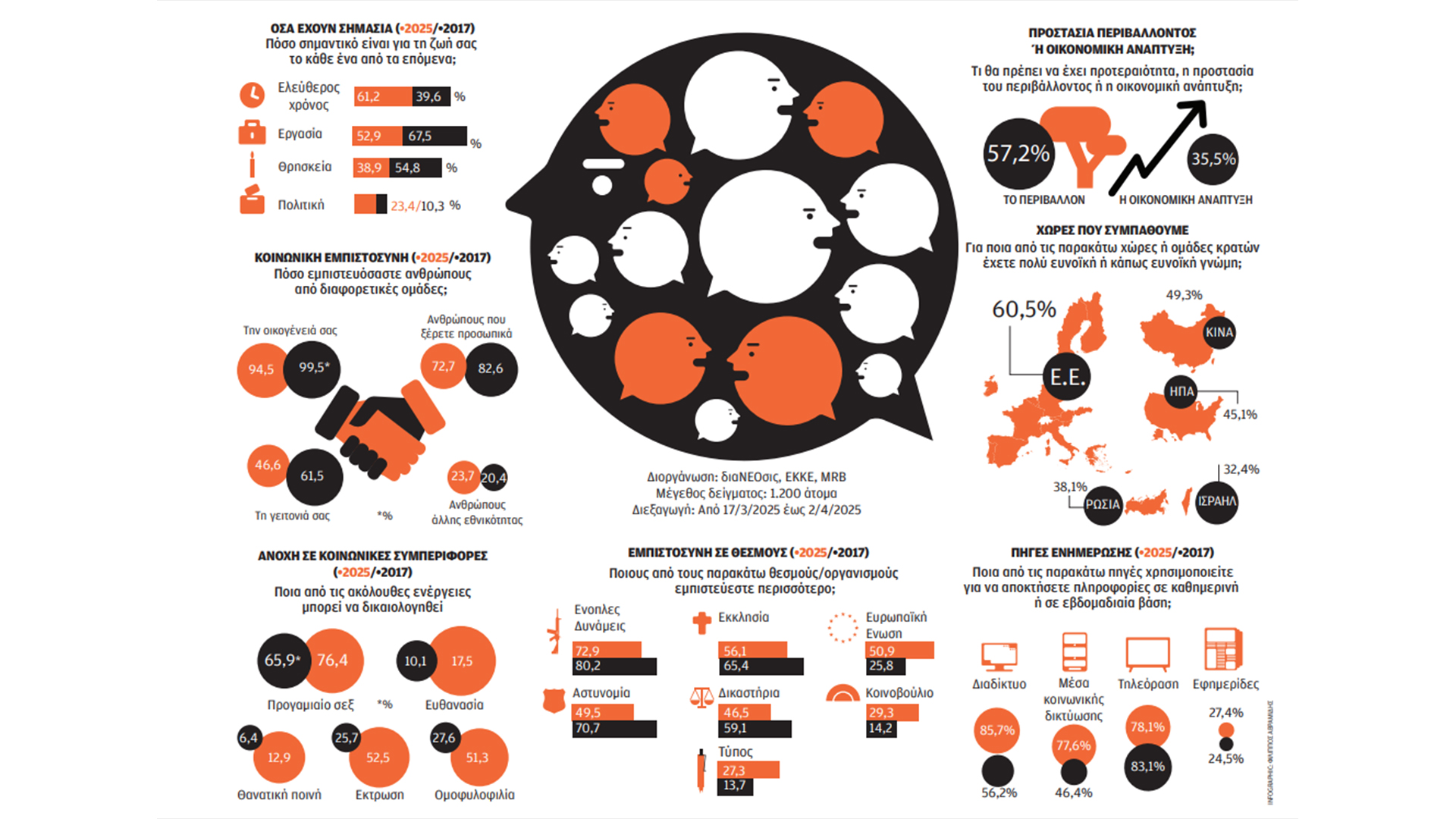 Τη δική του βαρύτητα έχει ο διπλασιασμός της αποδοχής αμφιλεγόμενων κοινωνικών συμπεριφορών όπως η ευθανασία (17,5%), η επαναφορά της θανατικής ποινής (12,9%), η αυτοκτονία (12,6%), η μη καταβολή εισιτηρίου στα μέσα μαζικής μεταφοράς (10,6%) και η διεκδίκηση κρατικών ωφελημάτων που δεν δικαιούσαι (9,5%). Στα πιο παρήγορα ευρήματα της έρευνας, η μέτρια θετική υποδοχή της τεχνητής νοημοσύνης (48,8%), η έντονα πλειοψηφική ανησυχία για την κλιματική αλλαγή, καθώς και το επίσης πλειοψηφικό ρεύμα υπέρ της προστασίας του περιβάλλοντος όταν τίθεται διαζευκτικά με το πρόταγμα της οικονομικής ανάπτυξης.