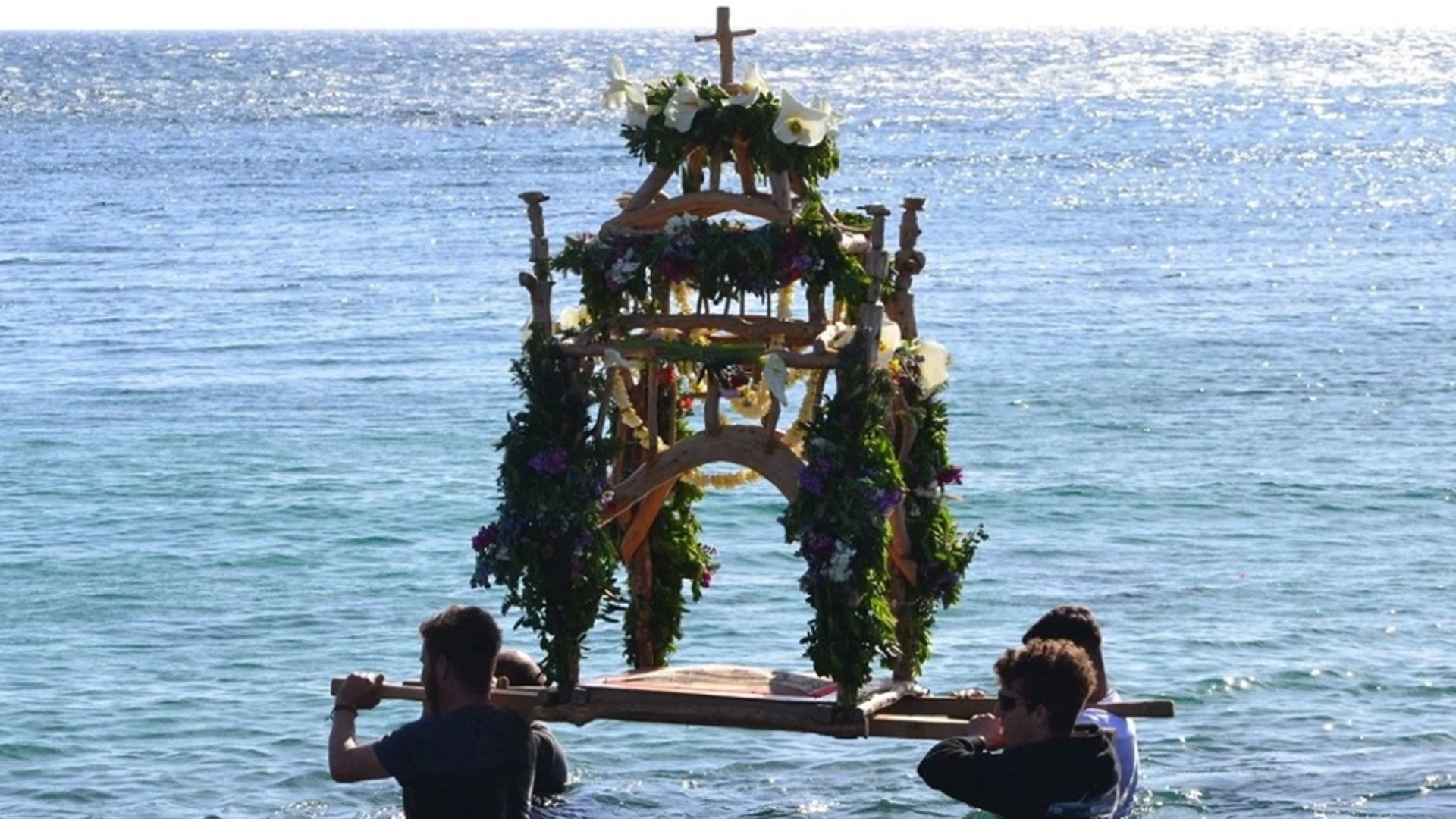 Εκεί τον περιμένουν οι ψαράδες, όπου με τη συνοδεία αλιευτικών κάνει τον κύκλο του λιμανιού και κατόπιν επιστρέφει στην παραλία.