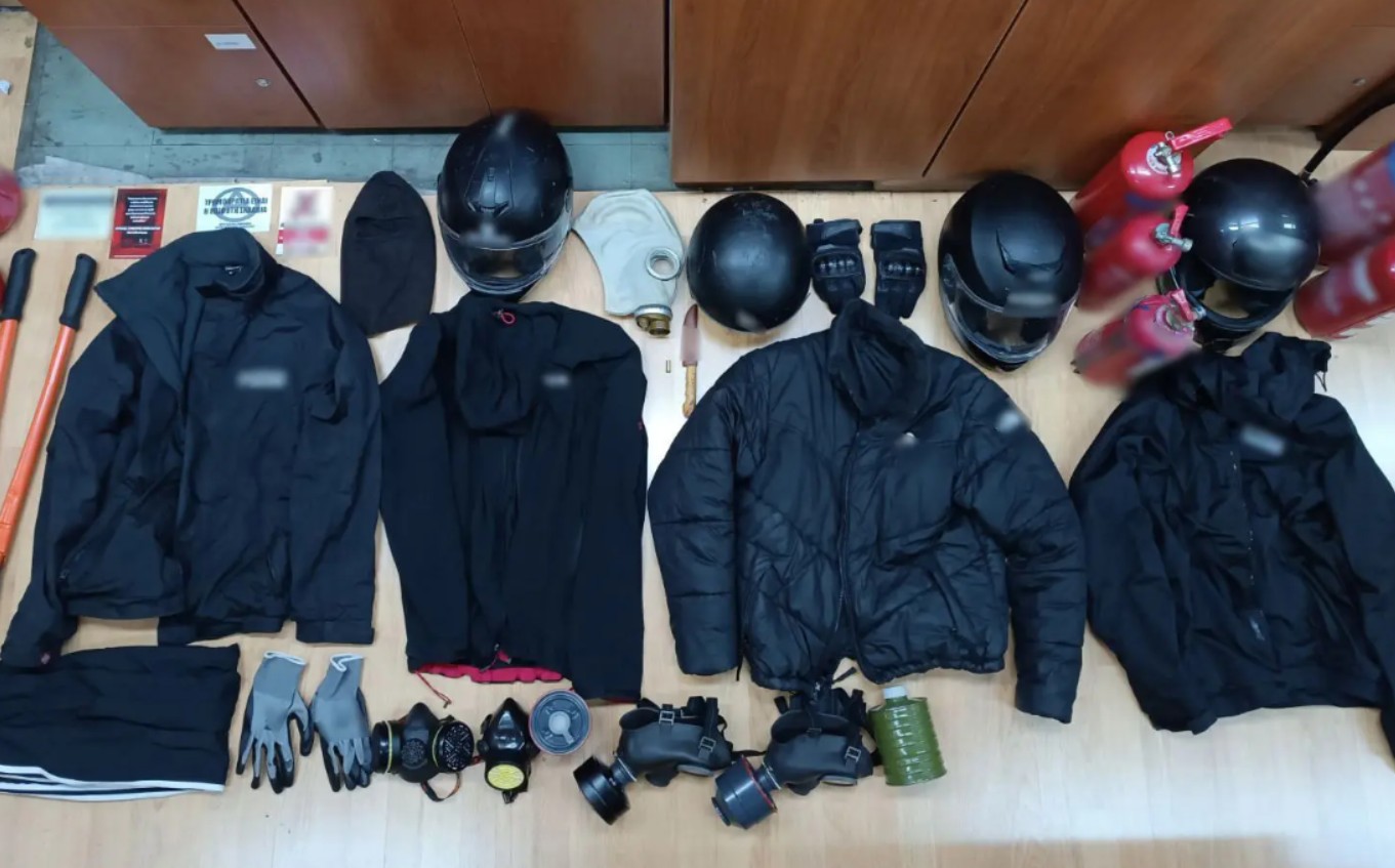 Κατά τη διάρκεια ερευνών σε οικίες και άλλους χώρους βρέθηκαν και κατασχέθηκαν μεταξύ άλλων ρουχισμός, πέντε αντιασφυξιογόνες μάσκες, φέιγ βολάν και έντυπο υλικό αναρχικού περιεχομένου, 17 κινητά τηλέφωνα, υπολογιστές, μέσα αποθήκευσης, τέσσερα κράνη, μάσκες full face, κάλυκας, μαχαίρι, μεταλλικός κόφτης και επτά πυροσβεστήρες ξηράς κόνεως.