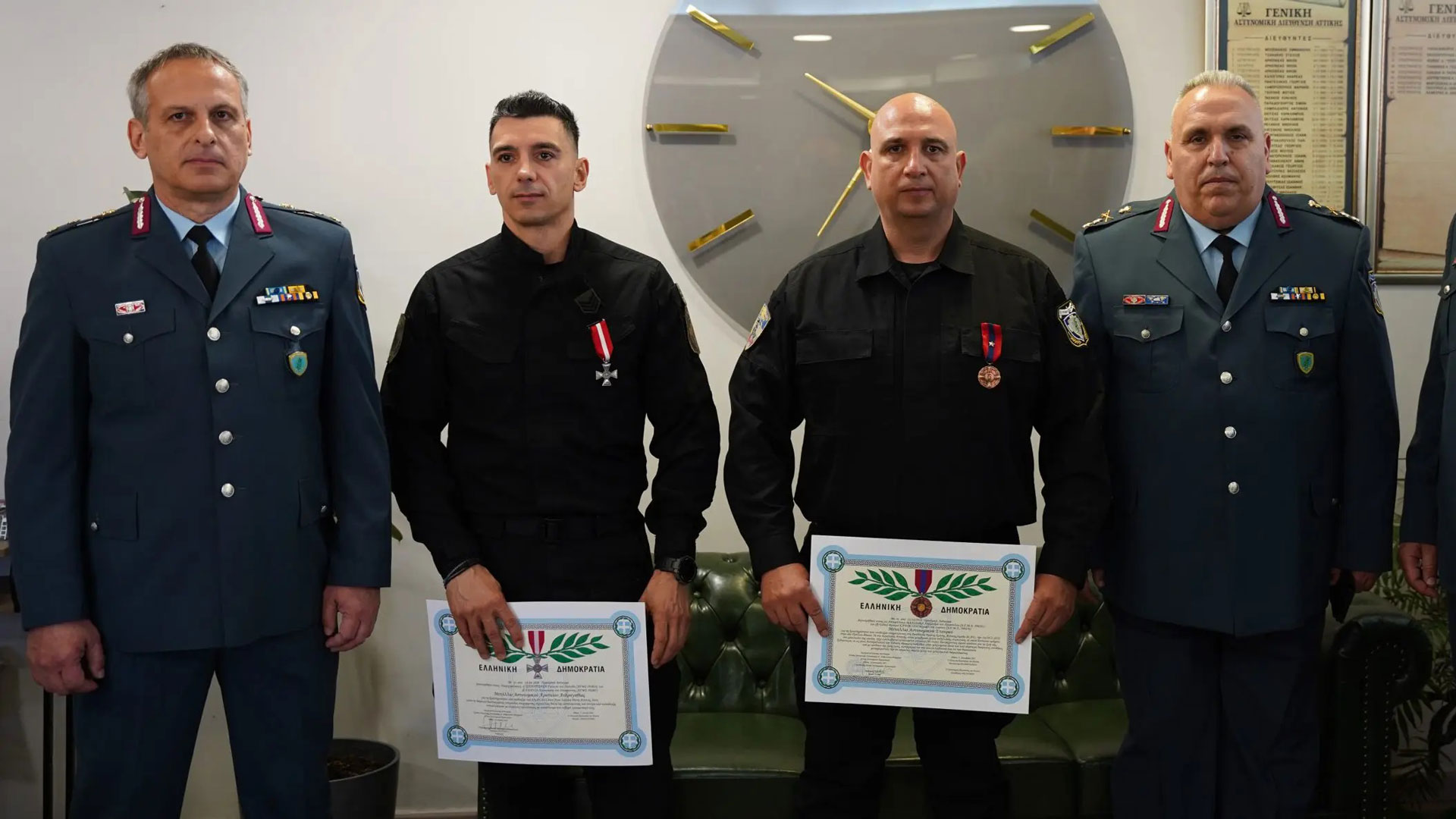 Σε ειδική τελετή που πραγματοποιήθηκε την Πέμπτη στη ΓΑΔΑ απονεμήθηκαν αστυνομικά μετάλλια, με αντίστοιχα διπλώματα «Αστυνομικού Αριστείου Ανδραγαθίας» και «Αστυνομικού Σταυρού», σε δύο αστυνομικούς της Ομάδας ΔΙ.ΑΣ., για έξοχη πράξη ανδραγαθίας και αυτοθυσία.