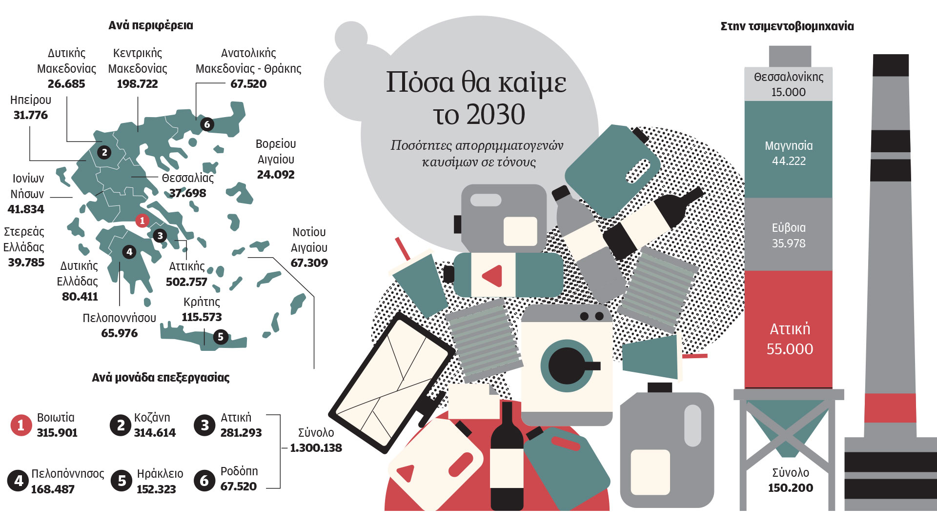 • Εκτιμάται ότι στη χώρα μας το 2030 θα παράγονται 1.450.339 τόνοι «απορριμματογενών ενεργειακών πρώτων υλών (ΑΕΠΥ)». Ο όρος αυτός αντιστοιχεί σε όλα τα προϊόντα της επεξεργασίας σύμμεικτων σκουπιδιών, όπως το SRF (που ονομάζεται και «κλάσης 3» και είναι καλύτερης ποιότητας) και το RDF, που είναι υποδεέστερης ποιότητας.
