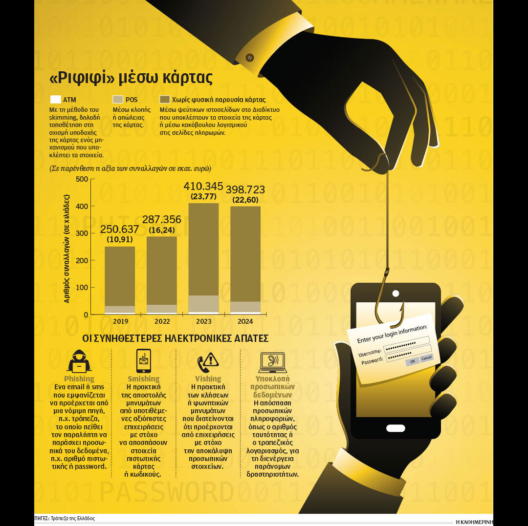 Μαζί με τις ηλεκτρονικές συναλλαγές αυξάνονται και οι απάτες με την υποκλοπή των στοιχείων των πιστωτικών ή χρεωστικών καρτών. Σύμφωνα με την Τράπεζα της Ελλάδος, το 2024 καταγράφηκαν 398.723 περιστατικά απάτης με κάρτες, εκ των οποίων τα 349.000 κατά τις συναλλαγές στο Διαδίκτυο, και τα ποσά που υπεκλάπησαν ανήλθαν σε 22,6 εκατ. ευρώ. Ο πιο διαδεδομένος τρόπος υποκλοπής των στοιχείων της κάρτας ή ακόμη και των στοιχείων ενός τραπεζικού λογαριασμού είναι οι ψεύτικες ιστοσελίδες και το δέλεαρ για την προσέλκυση των θυμάτων η εξαιρετικά χαμηλή τιμή κάποιου προϊόντος. Σε αντίθεση με την πεποίθηση ότι θύματα είναι μεγάλης ηλικίας άνθρωποι, τα στοιχεία δείχνουν ότι τα περιστατικά απάτης αφορούν κυρίως νέους 18 έως 27 ετών.