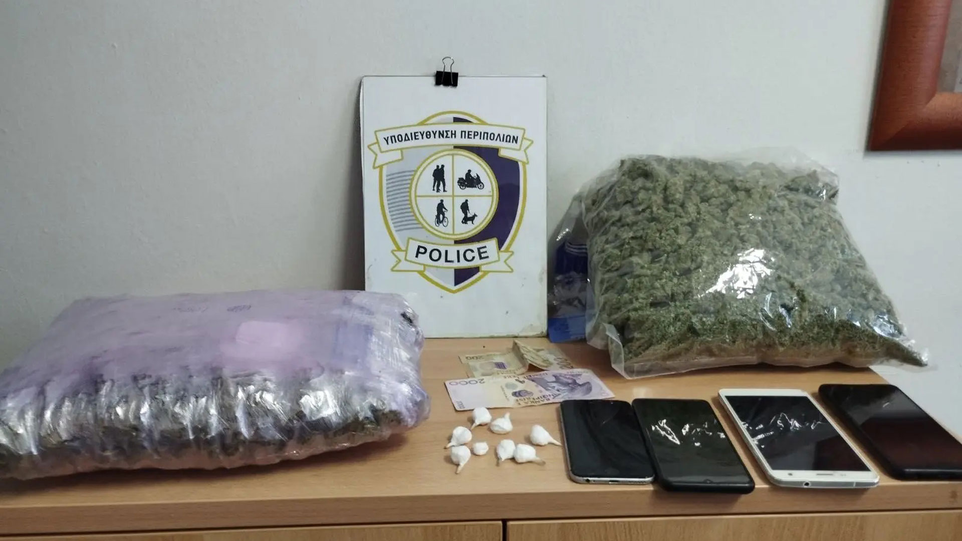 Από τις έρευνες στην κατοχή του, στο κομμωτήριο και στο σπίτι του, βρέθηκαν και κατασχέθηκαν 2 κιλά και 35 γραμμάρια κάνναβης, 8 γραμμάρια κοκαΐνης, το ποσό των 55 ευρώ και 2.200 λεκ Αλβανίας, καθώς και τέσσερα κινητά τηλέφωνα.
