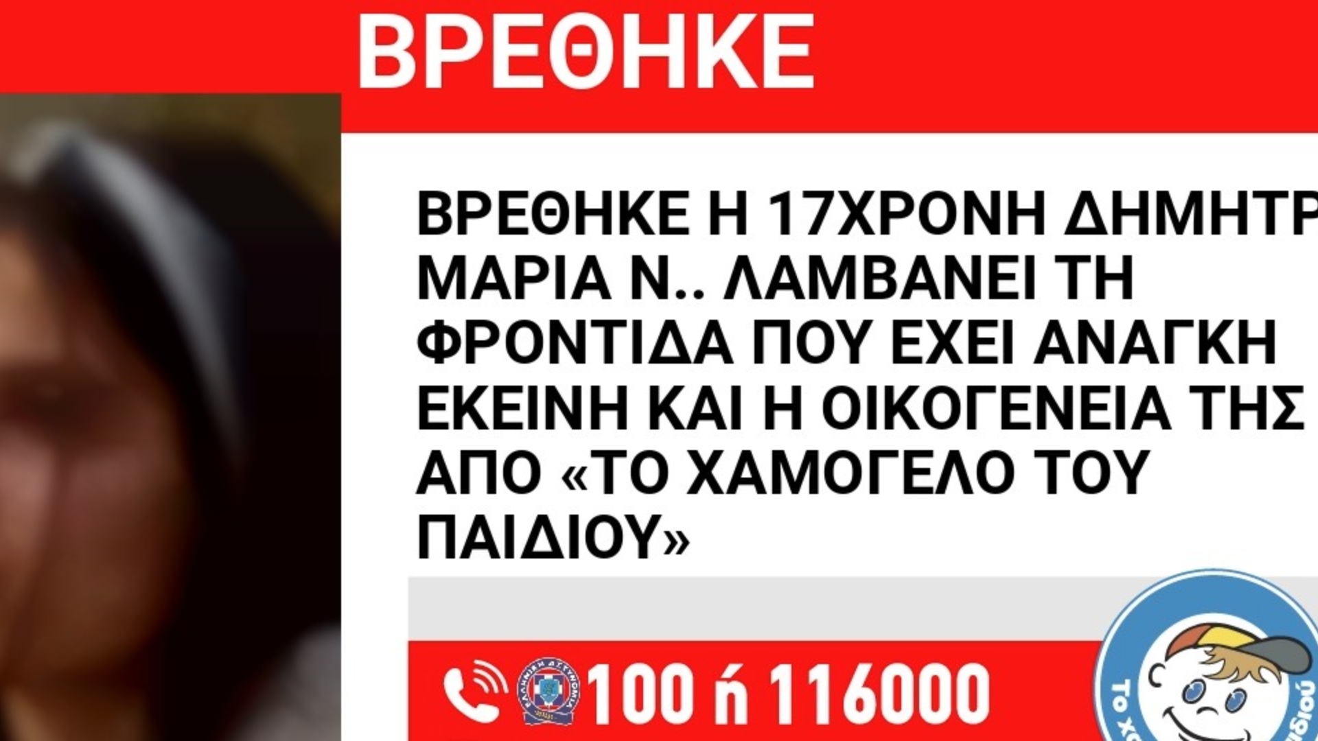 Αίσιο τέλος είχε η εξαφάνιση της 17χρονης Δήμητρας – Μαρίας που εξαφανίστηκε το μεσημέρι της 26ης Μαΐου από τον Νέο Κόσμο. Σύμφωνα με την ανακοίνωση από το Χαμόγελο του Παιδιού, η έφηβη βρέθηκε σήμερα και πλέον είναι με την οικογένειά της.