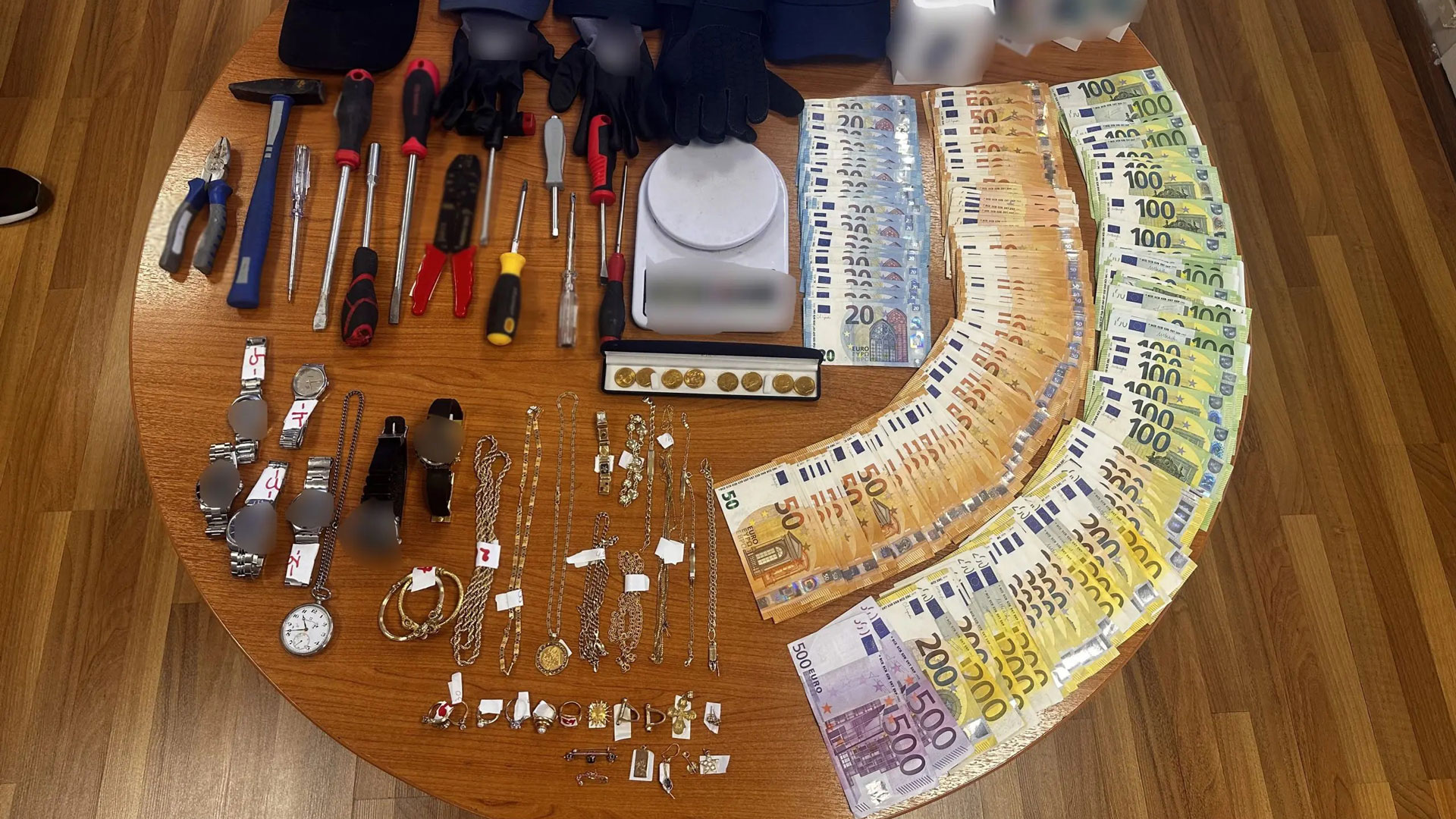Συνολικά, από τις έρευνες που διενεργήθηκαν, εντοπίστηκαν και κατασχέθηκαν τέσσερα οχήματα, 18.717 ευρώ, 2.205 δολάρια, 11 χρυσά νομίσματα, 10 ρολόγια και 7 δαχτυλίδια, 8 αλυσίδες και 2 σταυροί, 11 βραχιόλια, 4 μενταγιόν και 5 σκουλαρίκια, 2 γυναικείες τσάντες, είδη ιματισμού, 20 κινητά, 9 κάρτες sim, ζυγαριά ακριβείας, διαρρηκτικά εργαλεία (κατσαβίδια, σκάλα, γάντια, σφυρί, πένσα), ζεύγος πινακίδων, ηλεκτροκίνητη παιδική μηχανή καθώς και διάφορα έγγραφα και χειρόγραφες σημειώσεις. Οι συλληφθέντες οδηγήθηκαν στην αρμόδια εισαγγελική Αρχή.