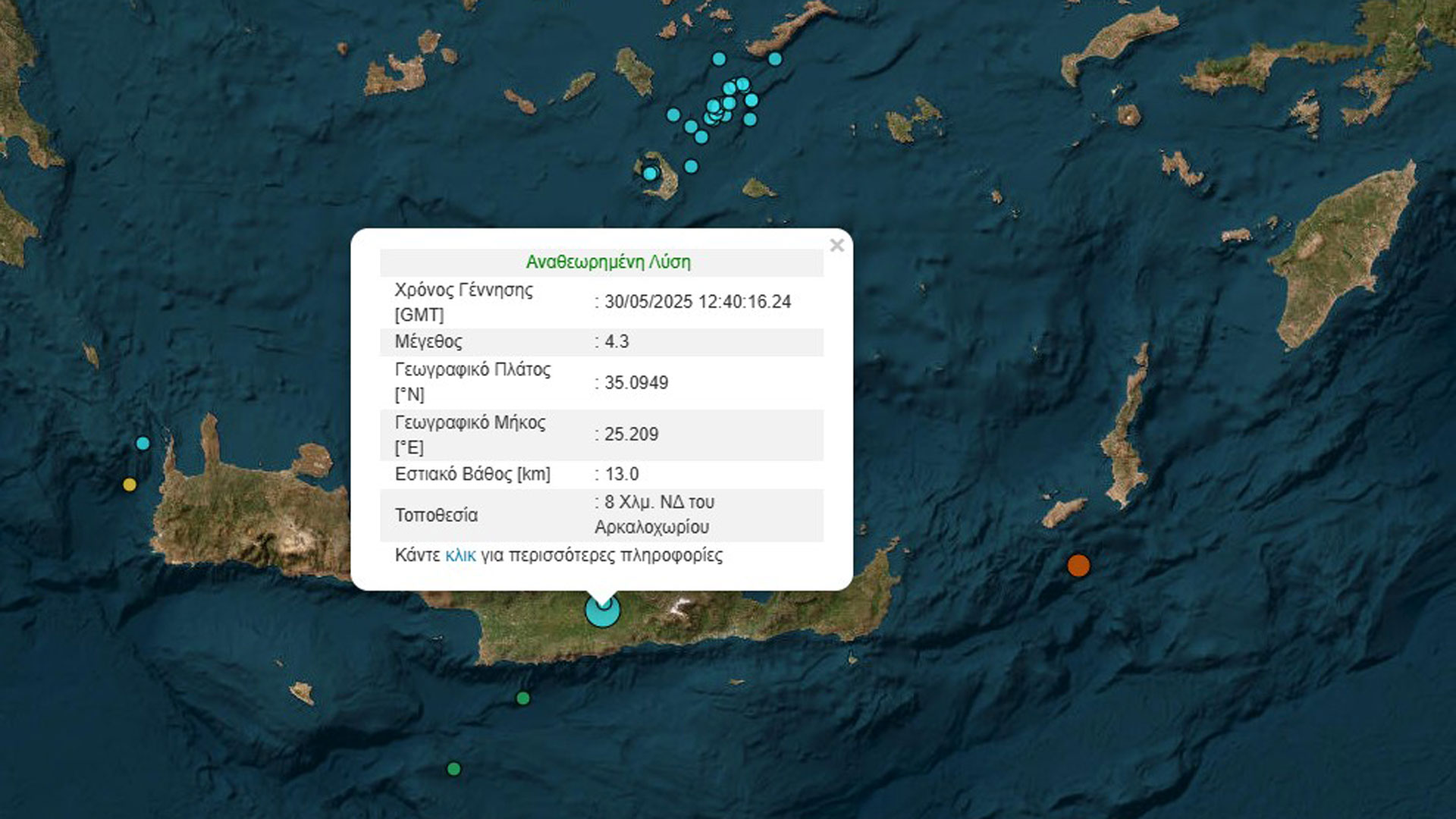 Σεισμική δόνηση μεγέθους 4,3 βαθμών της κλίμακας Ρίχτερ ταρακούνησε την Κρήτη στις 15:40 το μεσημέρι της Παρασκευής.
