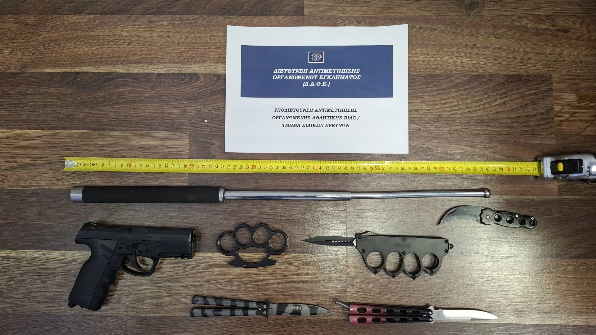Σε έρευνες, μεταξύ άλλων, βρέθηκαν και κατασχέθηκαν οκτώ αυτοσχέδιοι εκρηκτικοί μηχανισμοί, τρεις σιδερογροθιές, δύο μαχαίρια τύπου πεταλούδα, δύο αναδιπλούμενοι σουγιάδες, ξιφίδιο, κατσαβίδι, αεροβόλο πιστόλι, καθώς και το χρηματικό ποσό των 17.797,5 ευρώ.