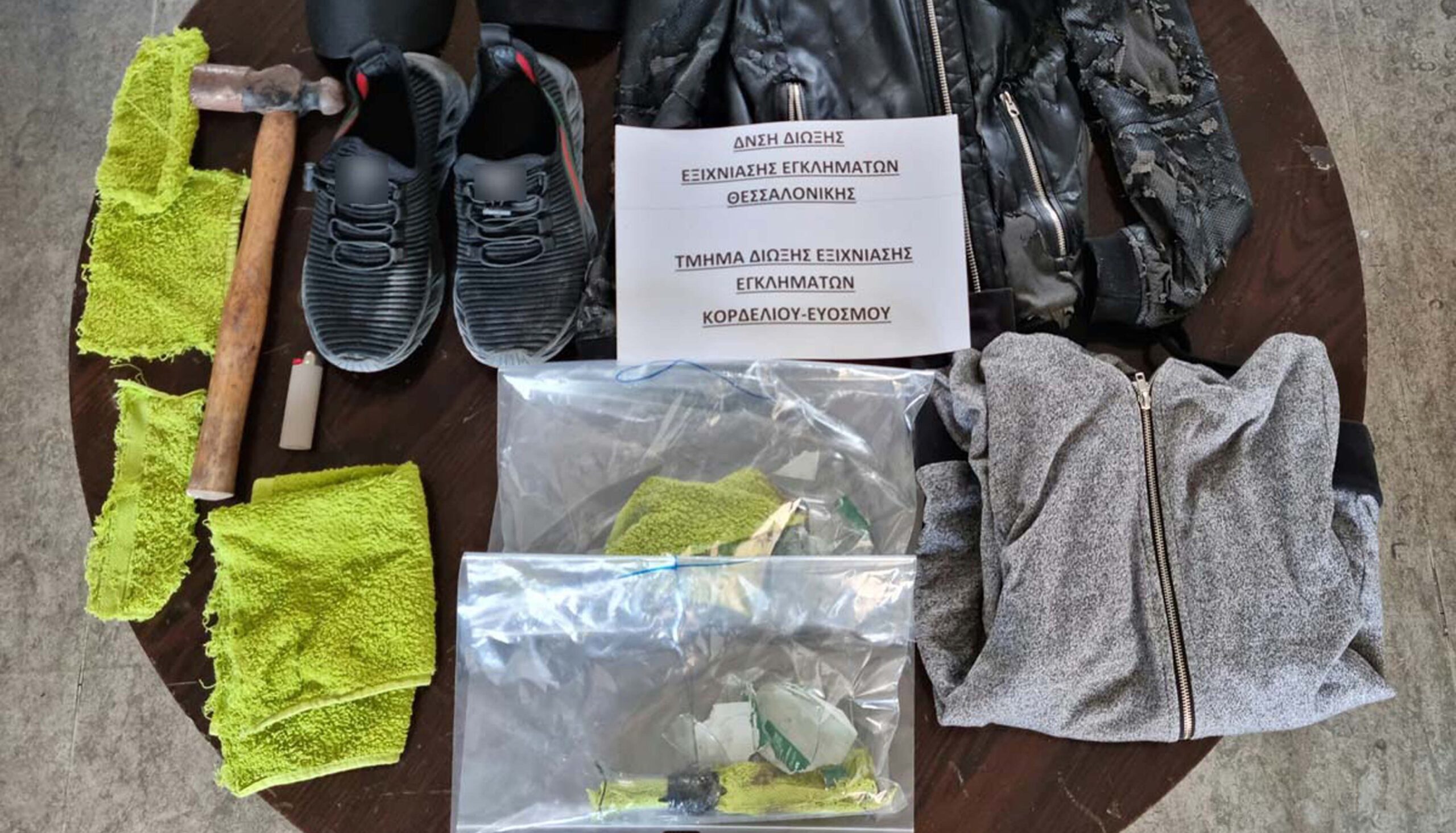 Σε έρευνα που έγινε στο σπίτι του συλληφθέντα, παρουσία δικαστικού λειτουργού, βρέθηκαν και κατασχέθηκαν είδη ένδυσης και υπόδησης που φορούσε κατά την τέλεση της πράξης, όπως επίσης ένας σφυρί που φαίνεται να χρησιμοποιήθηκε για τη θραύση της κρυστάλλινης τζαμαρίας της επιχείρησης, μέσω της οποίας οι δράστες πέταξαν τις μολότοφ, αλλά και κομμάτια πανιού για την κατασκευή των αυτοσχέδιων μηχανισμών, όπως αναφέρεται σε ανακοίνωση της αστυνομίας.