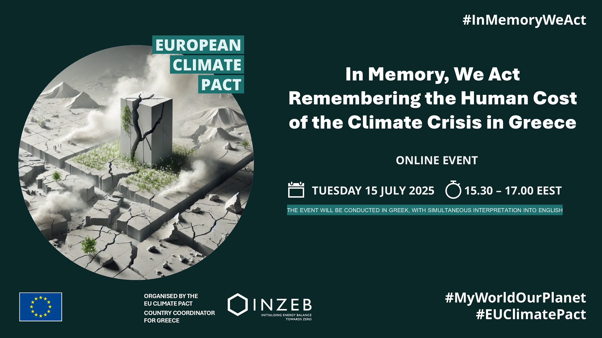 Με αφορμή την Ημέρα της Ευρωπαϊκής Ενωσης για τα Θύματα της Παγκόσμιας Κλιματικής Κρίσης μεθαύριο Τρίτη, 15 Ιουλίου, ο οργανισμός INZEB, ως Εθνικός Συντονιστής του Ευρωπαϊκού Συμφώνου για το Κλίμα στην Ελλάδα, διοργανώνει από τις 15:30 ως τις 17:00, μια διαδικτυακή εκδήλωση για να τιμήσει τη μνήμη των ανθρώπων που έχουν χάσει τη ζωή τους ή έχουν πληγεί από καταστροφές που σχετίζονται με την κλιματική κρίση στη χώρα μας.
