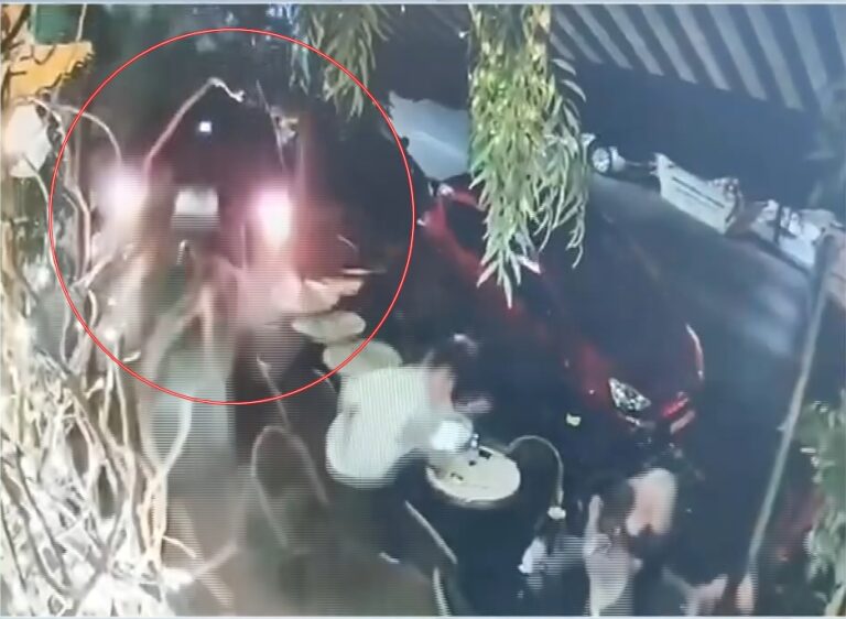 Το αυτοκίνητο φαίνεται να πέφτει πάνω σε τραπέζια και καρέκλες, παρασύροντας κάποιους από τους θαμώνες.