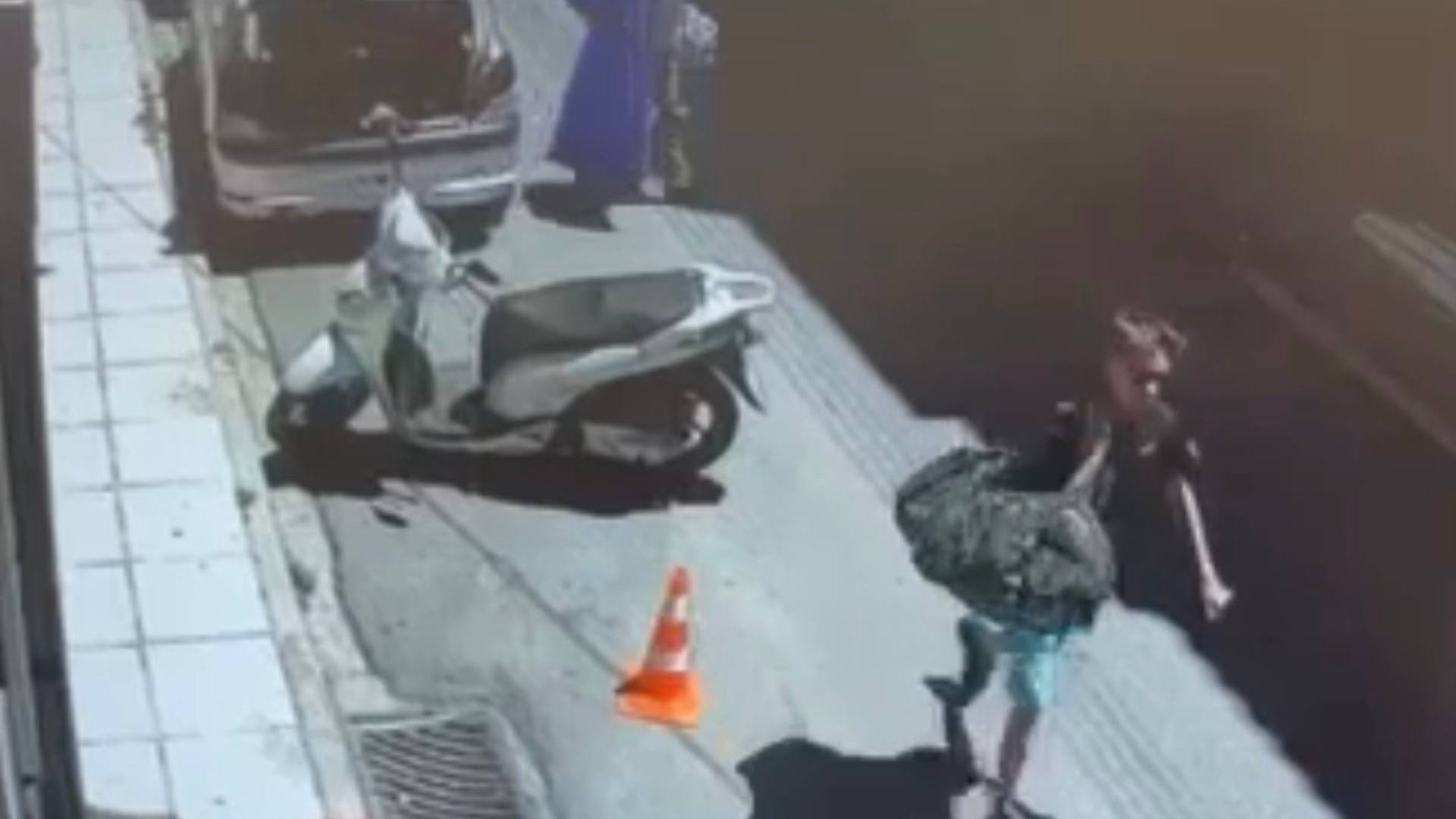 Φαίνεται να κινείται με γρήγορο βήμα, ενώ σε αντίθεση με τον συνεργό του, κρύβει το πρόσωπο του από την κάμερα ασφαλείας που βρίσκεται στο σημείο.