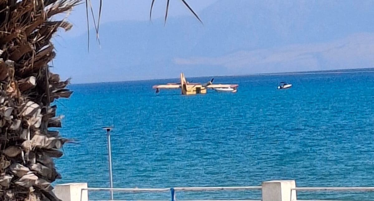 Το Canadair παραμένει στην επιφάνεια της θάλασσας, όπως φαίνεται σε βίντεο του KorinthosTv.
