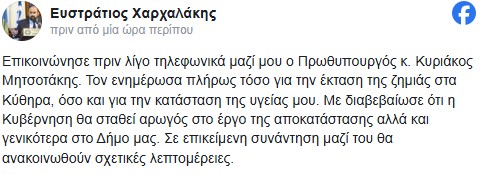 - 20:15Επικοινωνία Κυρ. Μητσοτάκη με τον δήμαρχο Κυθήρων