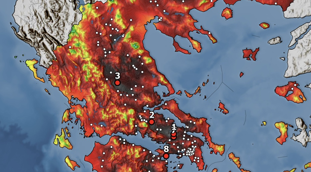Στον χάρτη του meteo.gr/ ΕΑΑ παρουσιάζεται η κατανομή της μέγιστης θερμοκρασίας στη χώρα καθώς και οι 8 σταθμοί με τις υψηλότερες μέγιστες. Οι λευκοί κύκλοι υποδηλώνουν τους σταθμούς όπου η μέγιστη τιμή θερμοκρασίας ξεπέρασε τους 37 °C.