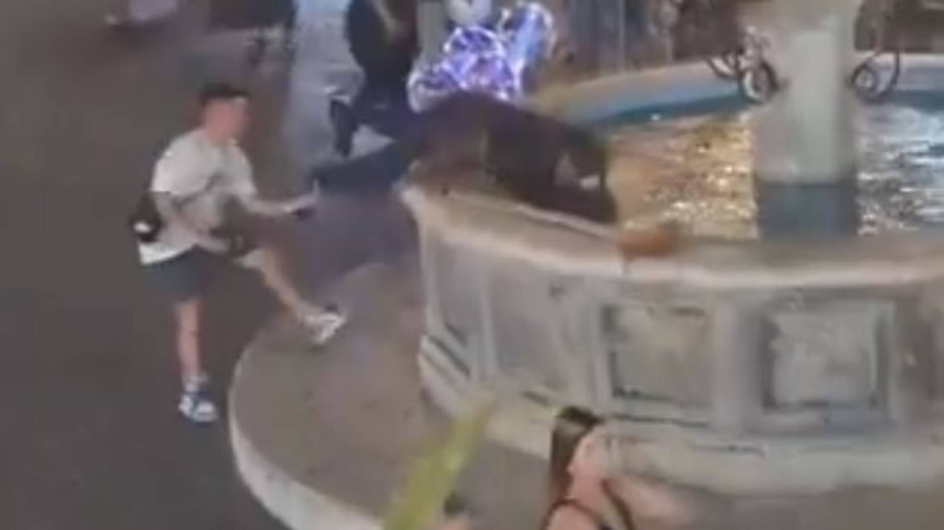 Στο βίντεο φαίνεται ο νεαρός να τον πλησιάζει, να τον σπρώχνει στο σιντριβάνι και ύστερα να απομακρύνεται από το σημείο.