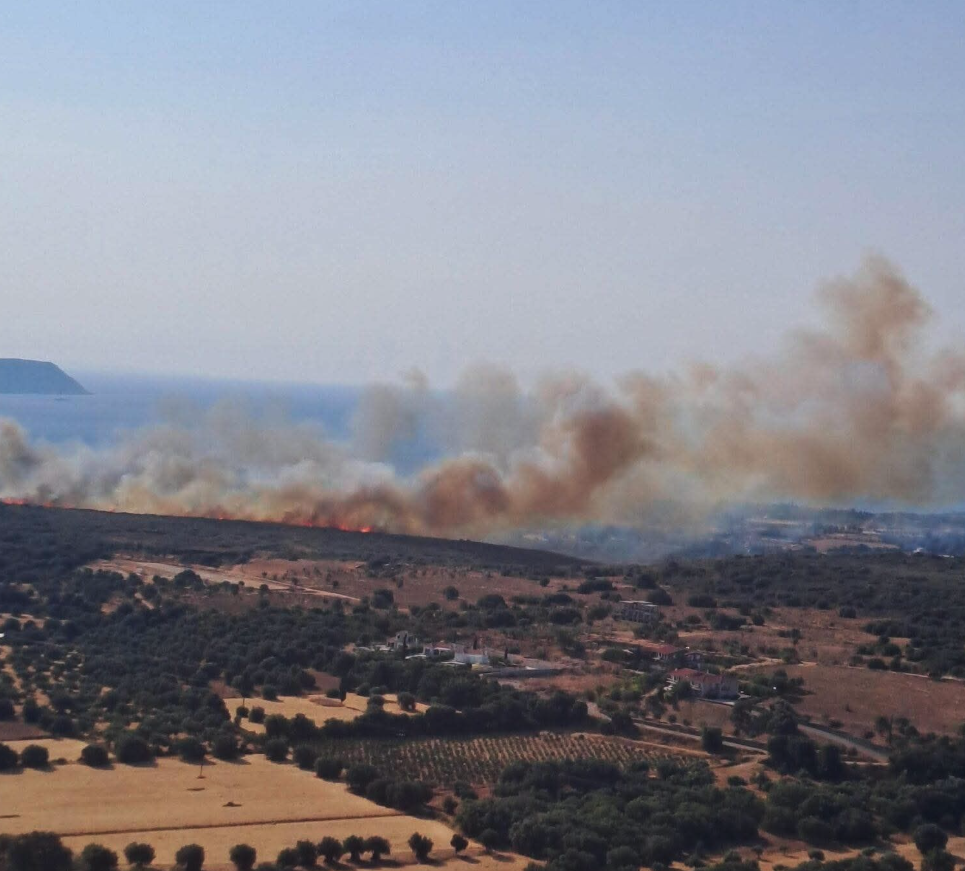 Λίγο μετά την εκδήλωση της πυρκαγιάς, η οποία μαίνεται σε αγροτοδασική έκταση, εστάλη και μήνυμα του 112 για εκκένωση τριών περιοχών του νησιού.