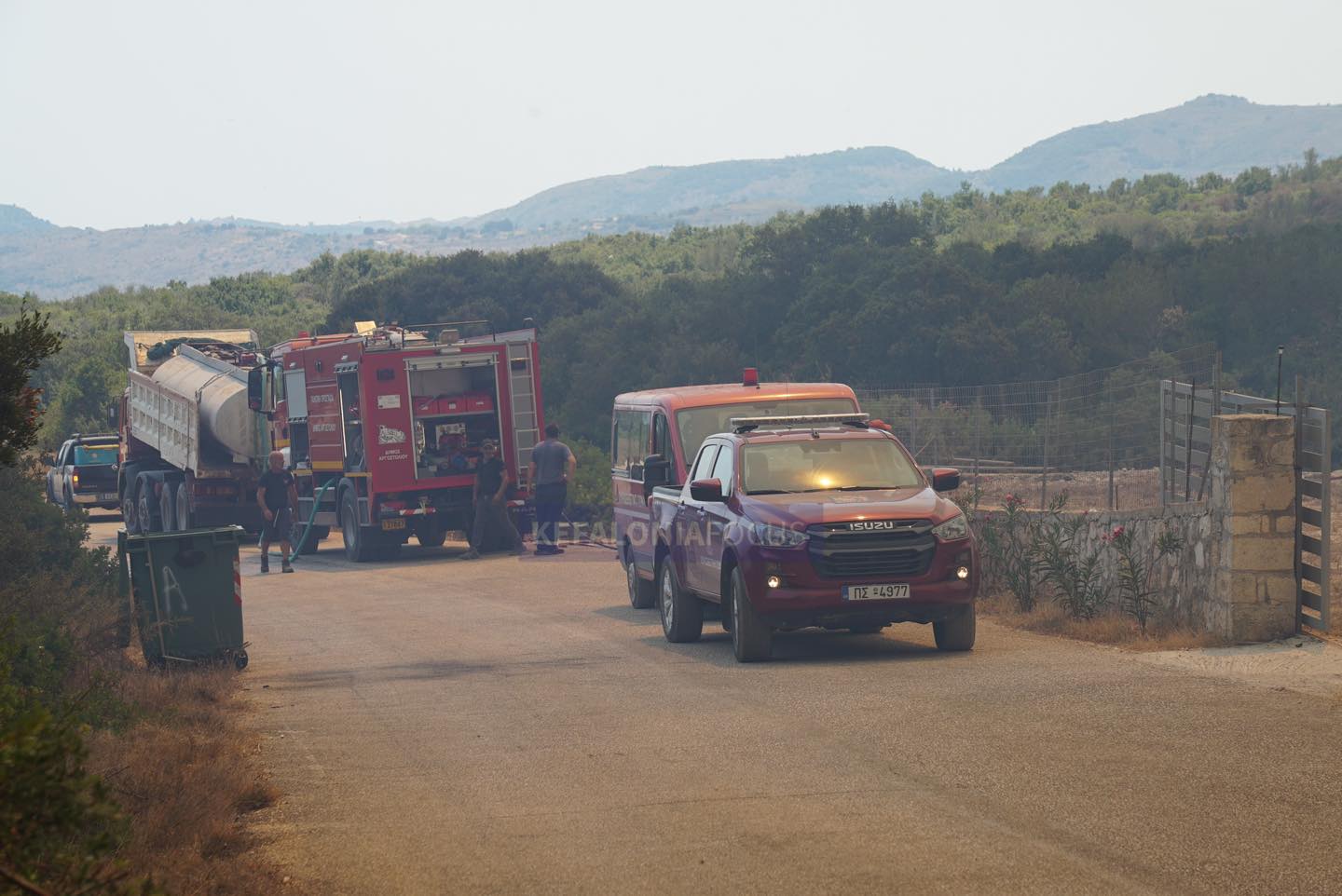 - Επιχειρούν 32 πυροσβέστες, 14 οχήματα, 1 ελικόπτερο, υδροφόρες δήμου και εθελοντές.