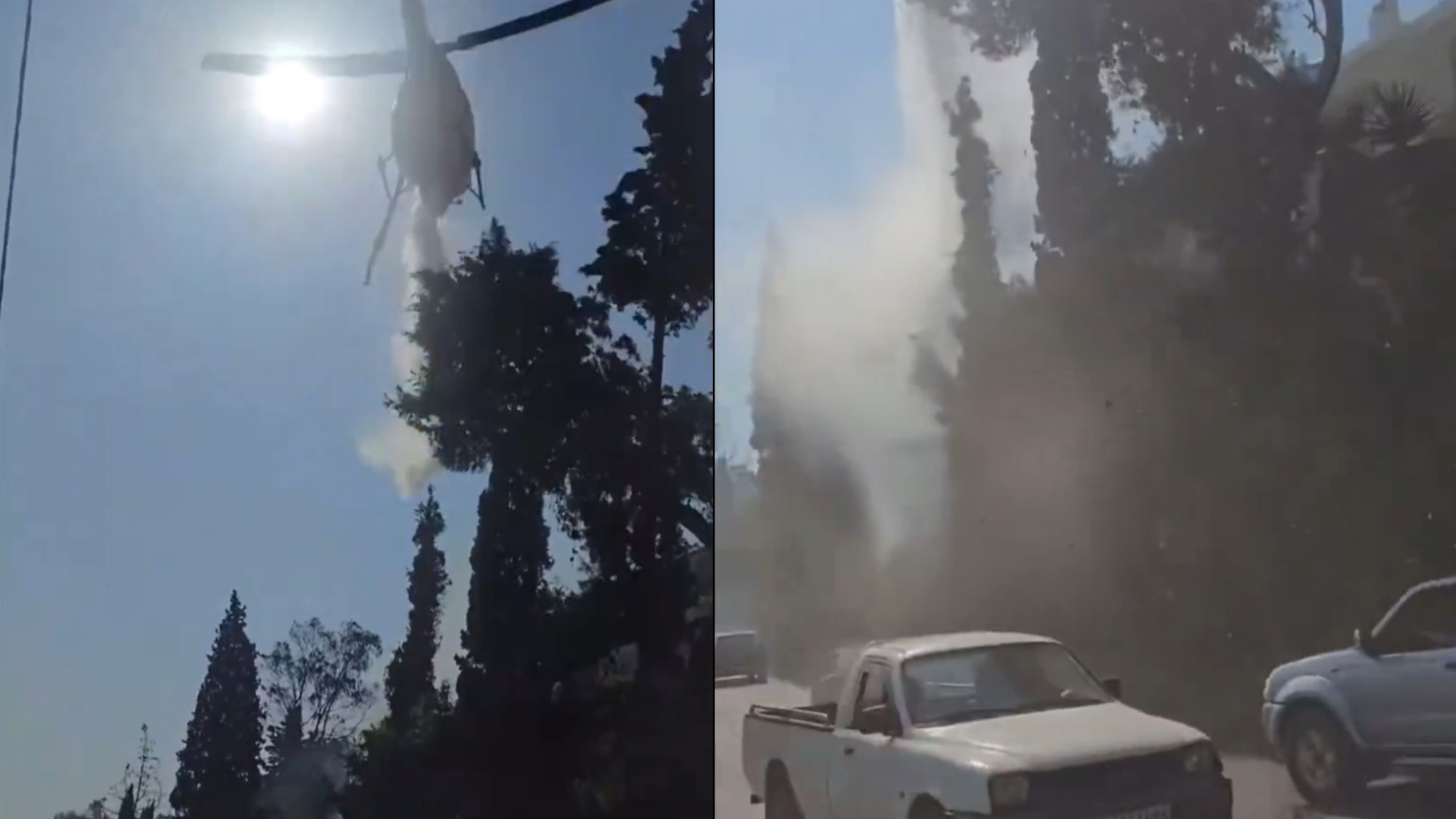 Συγκεκριμένα, στα πλάνα διακρίνεται το ελικόπτερο να κάνει ρίψη νερού, με την πίεση του νερού να σπάει κλαδιά δέντρων που καταλήγουν σε διερχόμενα αυτοκίνητα.